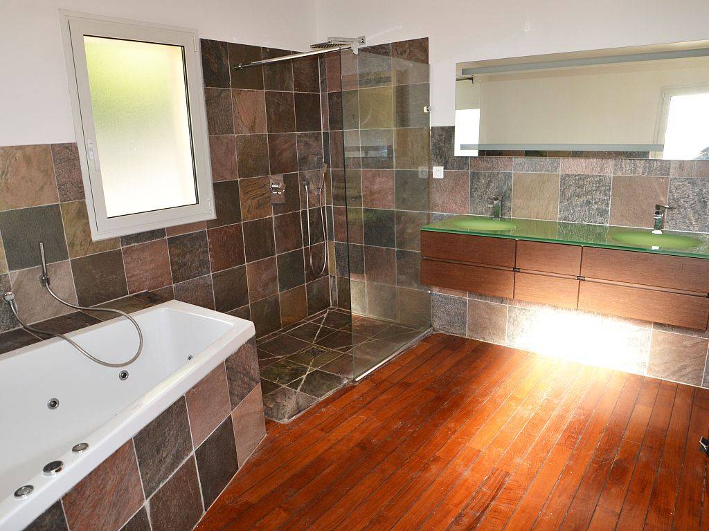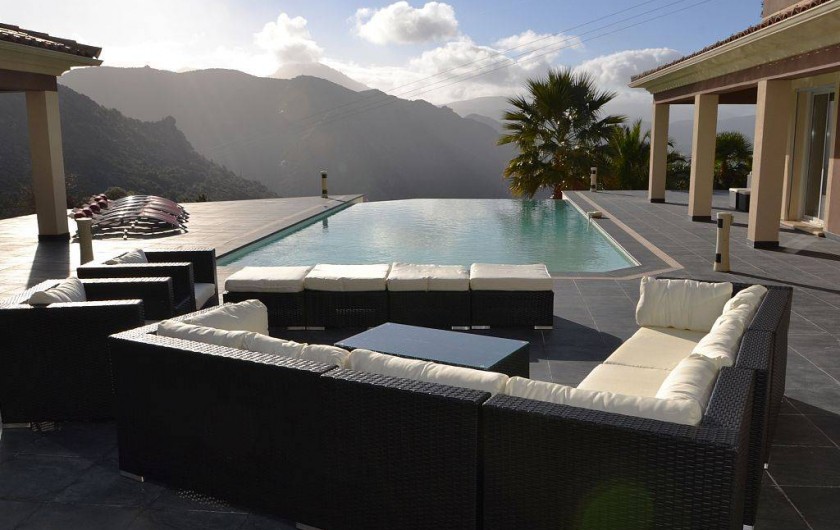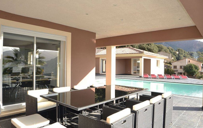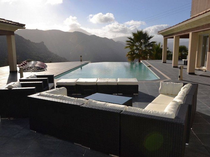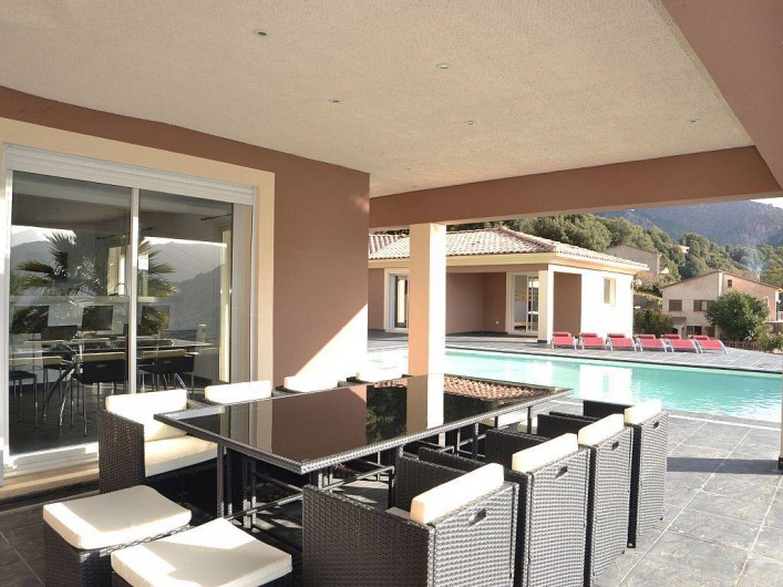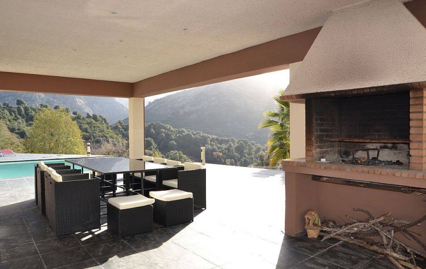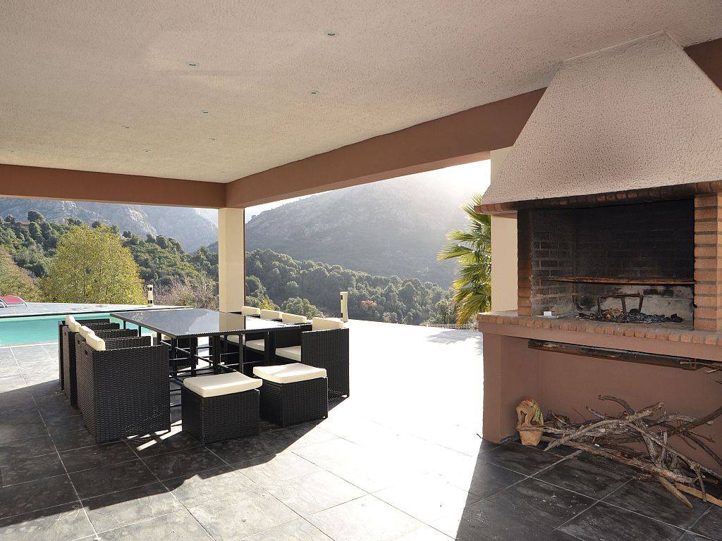 La terrasse de 250 m2 donne sur la montagne, en étant protégée par la disposition 'californienne' des pièces de la villa. Elle entoure la piscine de 50 m2, dont la profondeur varie de 0,8 à 2,5 m. Des chaises longues et des fauteuils d'extérieur vous accompagneront dans les moments de détente. Un grand âtre à barbecue et une vaste table extérieure ombragée sont disponibles à proximité immédiate de la cuisine.