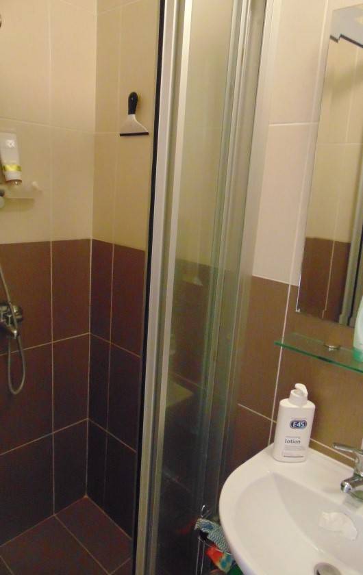 d'une cuisinière ainsi que d'un réfrigérateur and d'une microonde. Il y a une salle de bains et un douche.