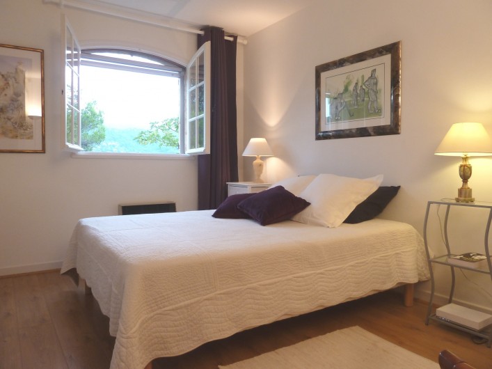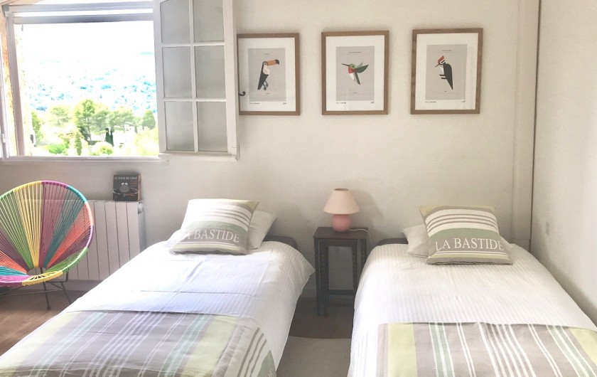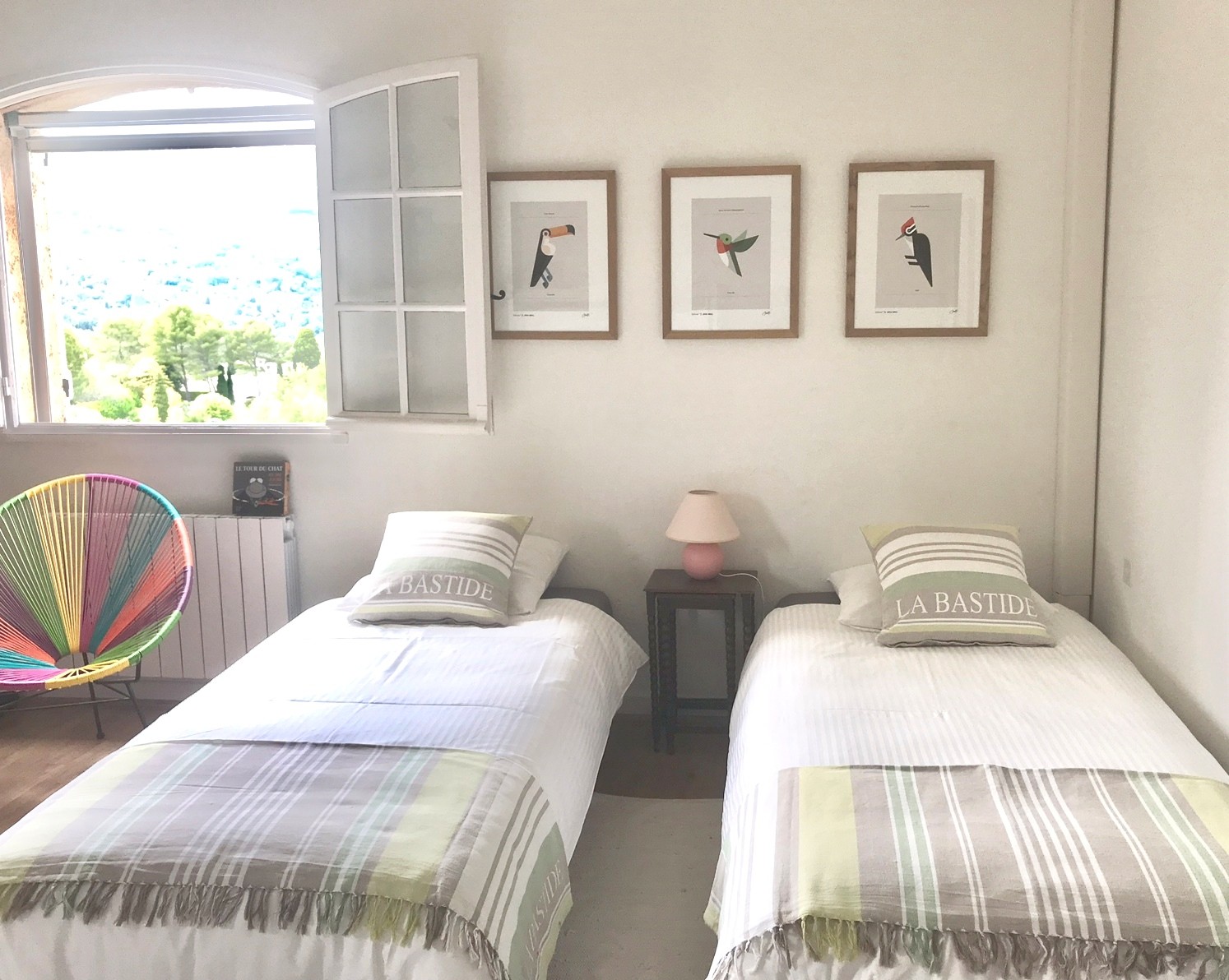 2 lits de 90 , armoire. Salle de bain avec WC. Les deux chambres ont une vue panoramique sur l'arrière pays Grassois et le plateau de Caussols.