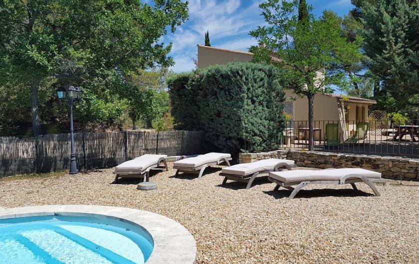 La piscine privée de 5.5x11m est clôturée et dispose de lit de repos en teck avec coussins ainsi que mobilier de jardin., Un grand parasol noir superbe sur les photos de cette année 2020.