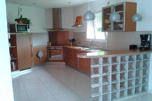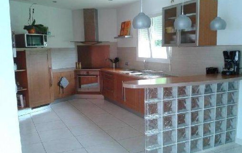 Une cuisine américaine avec lave vaisselle, micro ondes, plaque à induction, réfrigérateur. Lave linge et mini congélateur se trouvent dans le garage.