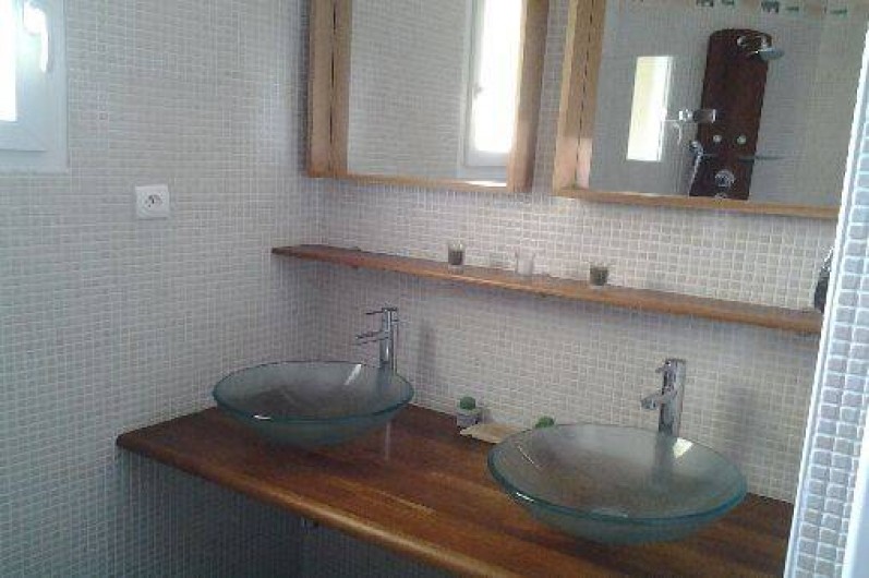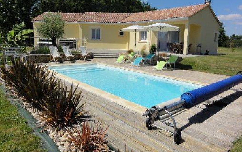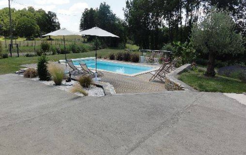 Deux grandes terrasses, une en bois bordant la piscine, l'autre la surplombant.