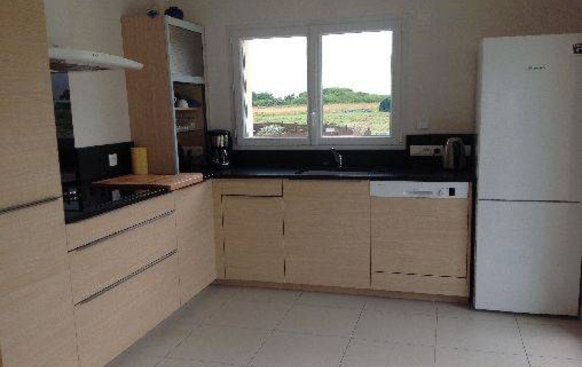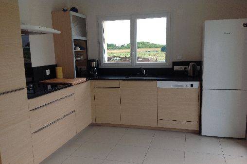 Une cuisine aménagée indépendante qui communique avec le salon par une grande porte coulissante de 1m40
