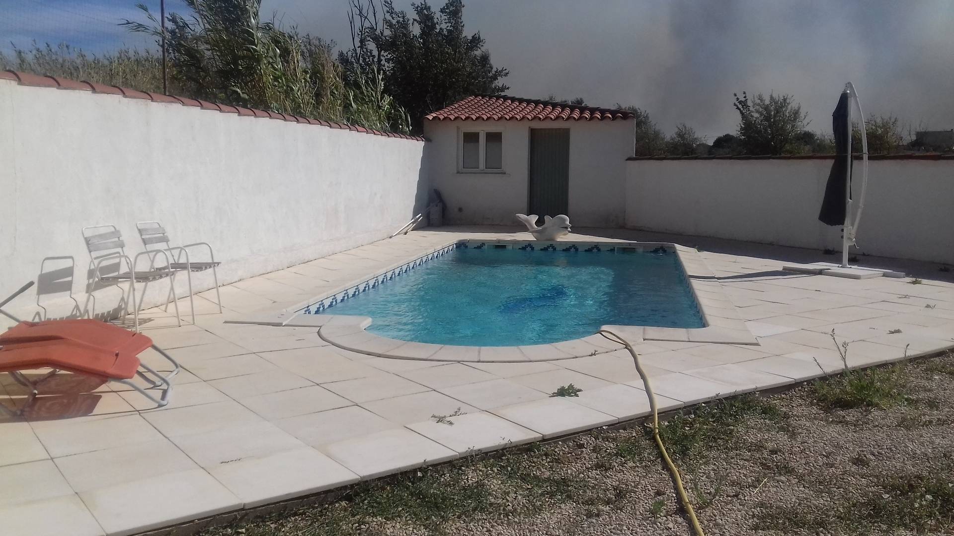 À l'extérieur cour ombre naturelle avec barbecue et emplacement stationnement fermé, côté piscine salon de jardin et transat.