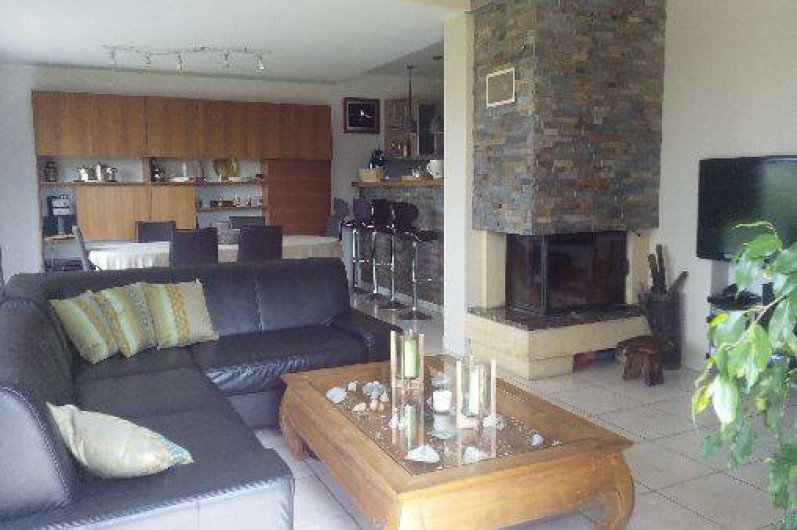 - un grand salon avec une cheminée, un grand d’angle, une table basse opium