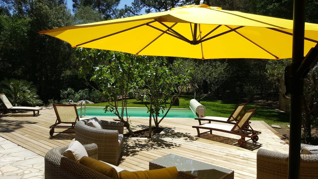 La terrasse de 100m² est partiellement couverte ce qui permet de manger presque tout le temps à l'extérieur.