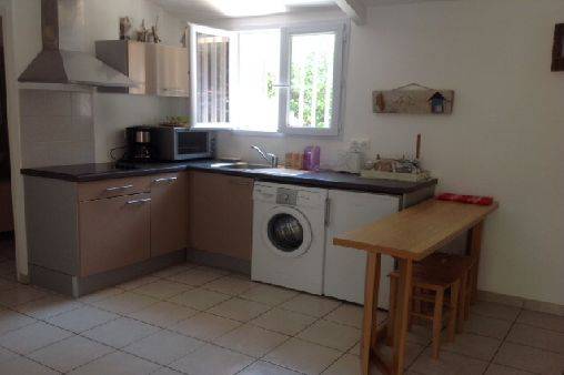 Maison neuve climatisée, pourvue d'une terrasse éclairée de 25 m2, cuisine équipée ouverte sur un salon comprenant un canapé lit.