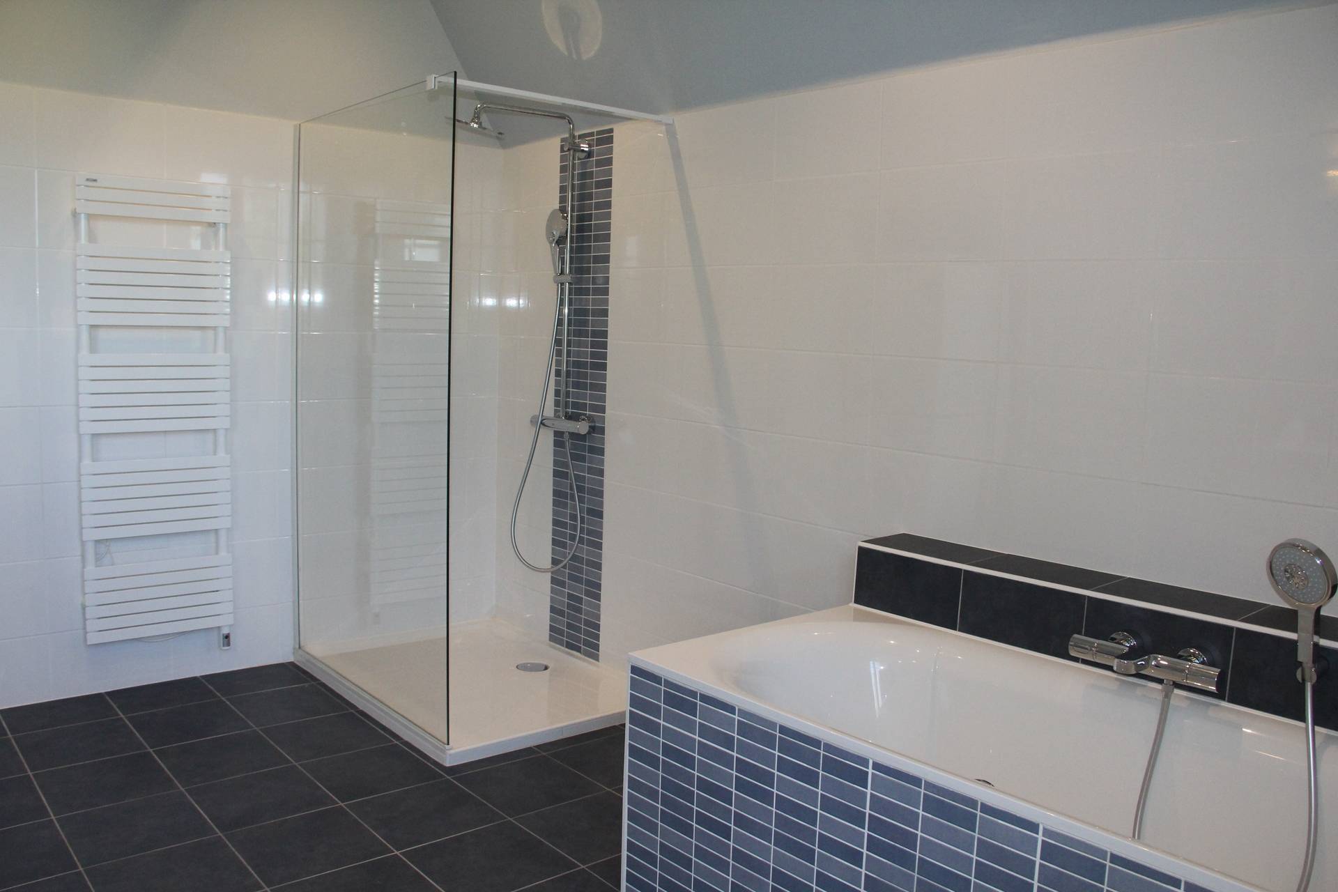 - 1 grande salle de bain (baignoire, grande douche 90x120, lavabo double vasque).