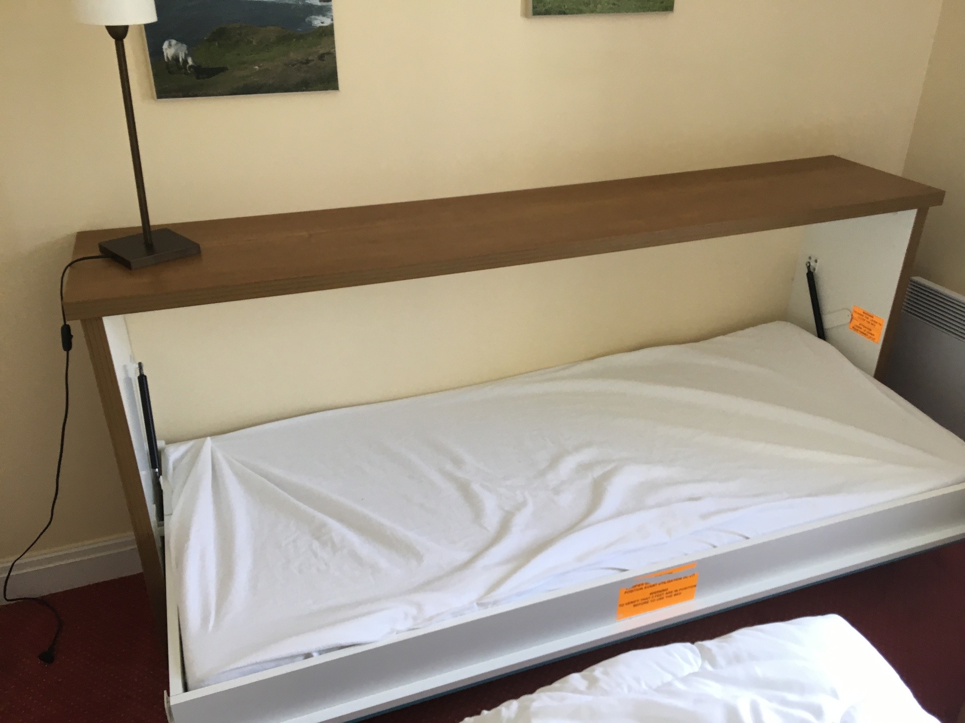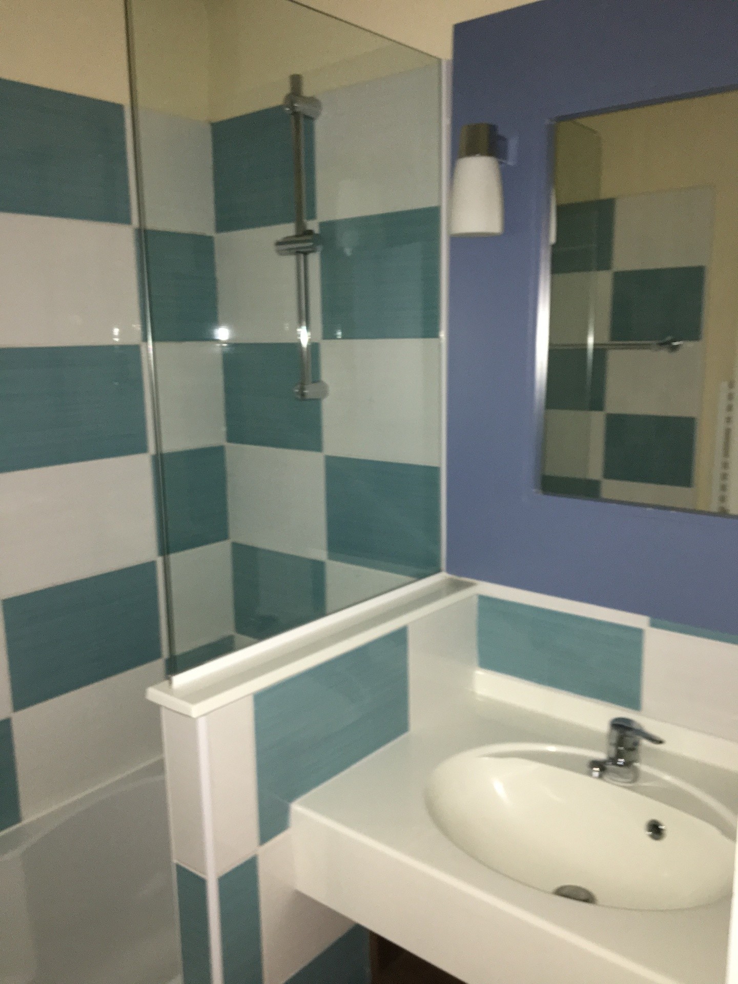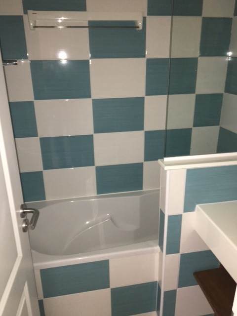 Etage, 1 chambre avec 2 lits de 90/ 190 convertibles en 1 gd lit 180 et 1 banquette murale 90*190 rabattable ,Salle de bains avec baignoire/douche grand sèche-serviettes mural .