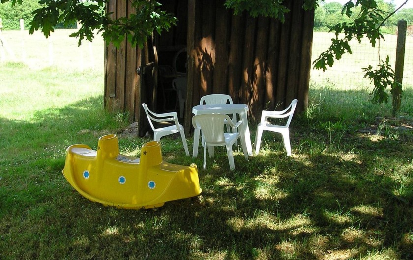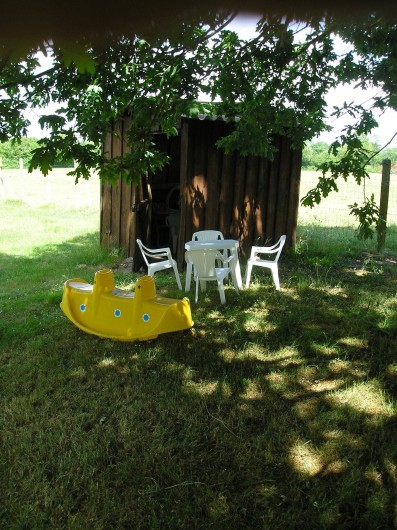 familles avec jeunes enfants (mobilier de puériculture, lit bébé, cabane et jeux dans le jardin).