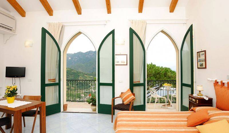 Rosa Canina :C'est un grand studio de 40 mètres carrés au rez de chaussée de la villa. Il dispose d'un petit balcon avec vue sur la mer, vue panoramique sur Scala, Ravello et Villa Cimbrone.