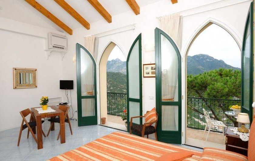 Lillà : C'est une chambre double d'environ 25 mètres carrés avec petit balcon et vue magnifique sur la mer, vue panoramique sur Scala, Ravello et Villa Cimbrone, Ponton et les ruines de la basilique de Saint-Eustache, Atrani, Amalfi et Amalfi.