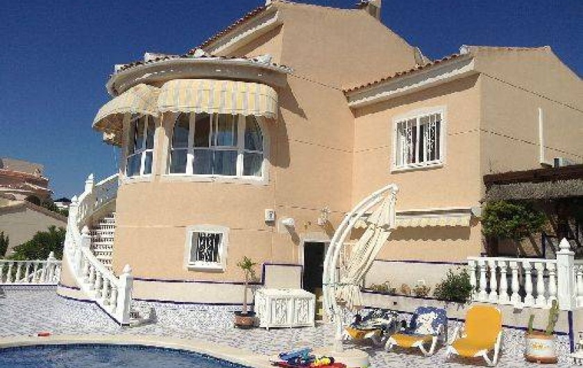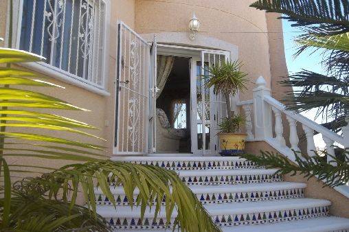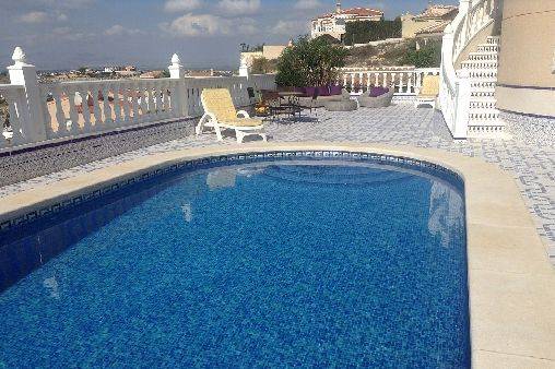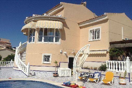 Luxueuse villa entièrement climatisée de 4 chambres, 3 salles de bain, sur 2 étages avec piscine privée et chauffée, terrasses et jardin, près de la mer (Guardamar et Torrevieja à 5 mn) avec magnifique vue sur golf internationnal,vallée et montagne.