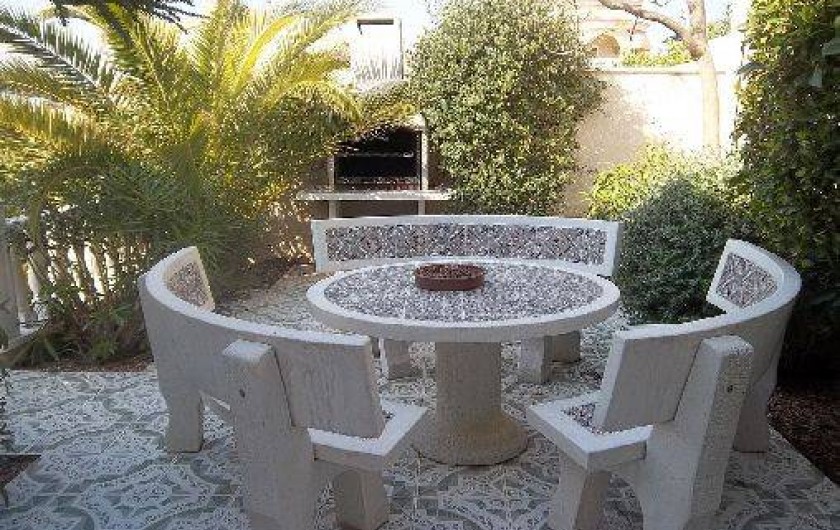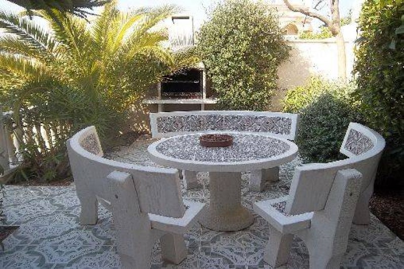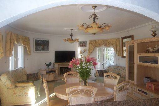 Villa climatisée pour 8 personnes. Garage fermé. Nombreuses petites terrasses en dénivelé équipées avec tables et chaises, ainsi que barbecue pour manger dehors, belle piscine (10/4) entourée de plages dallées, store, parasol et transats.