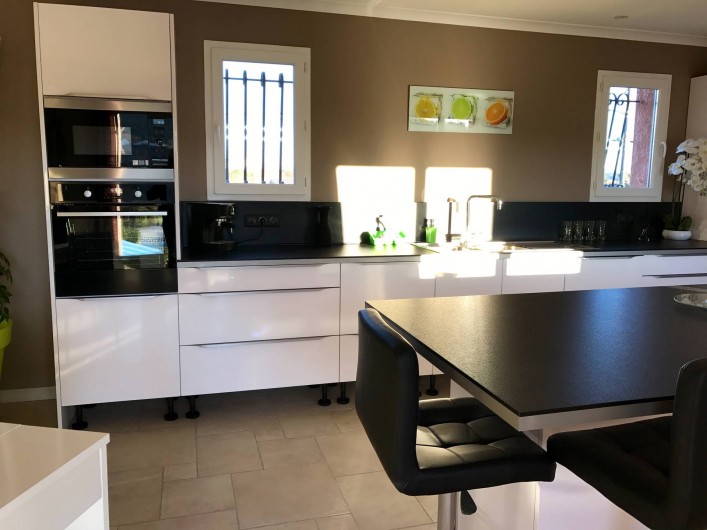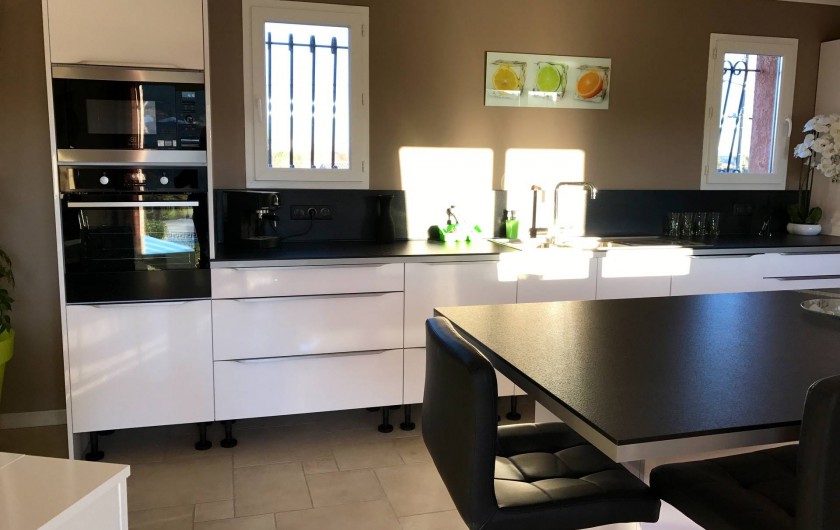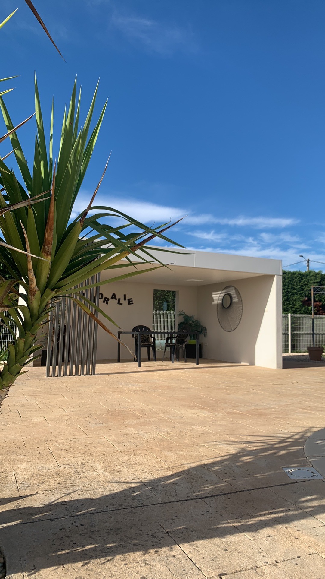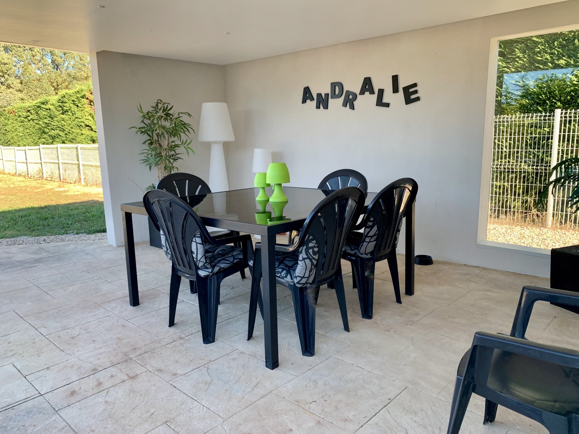 Villa lumineuse à la décoration moderne, soignée et de bon goût. Cuisine très moderne et poolhouse design pour vos repas à l’ombre en extérieur.