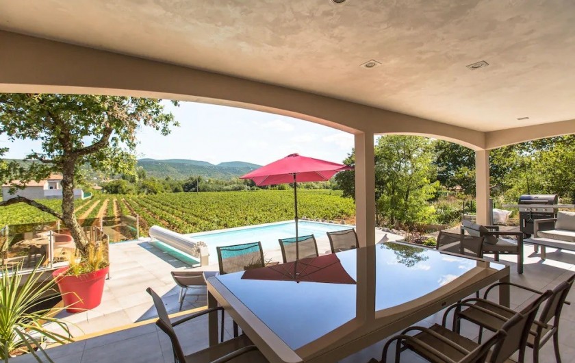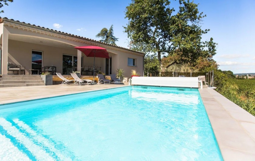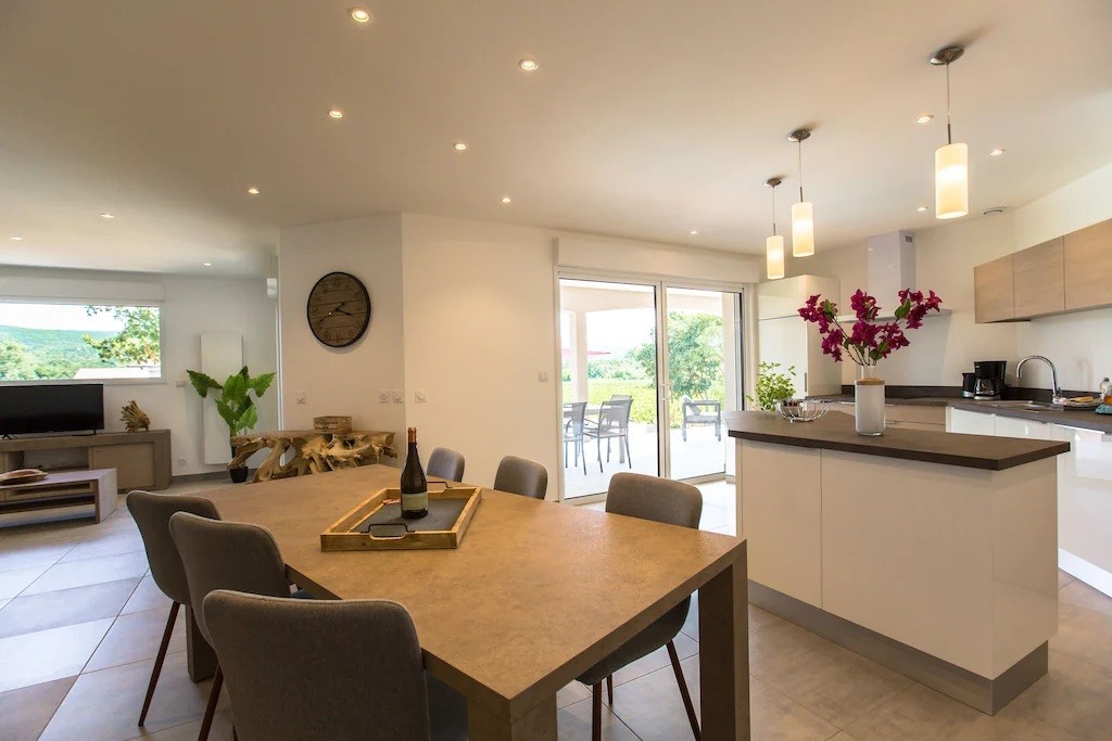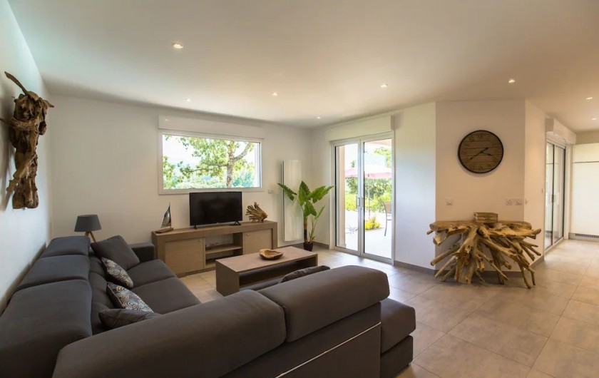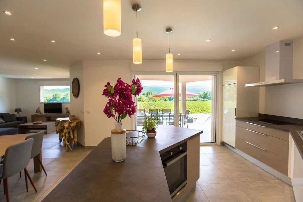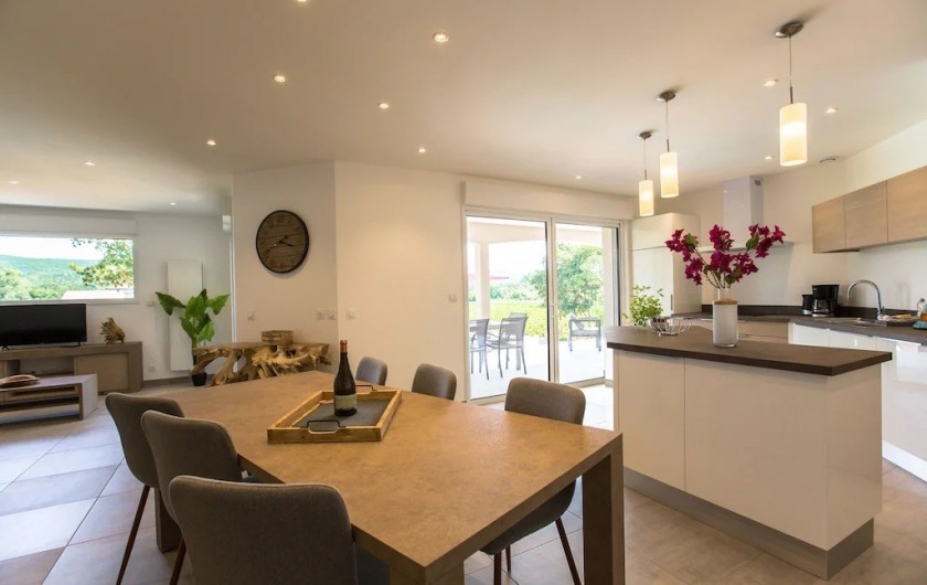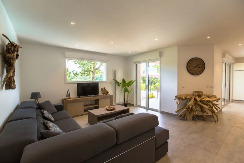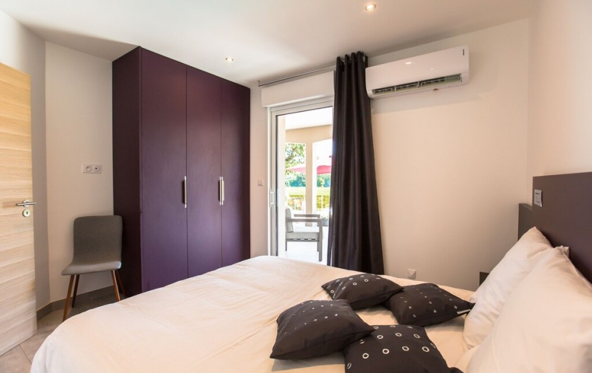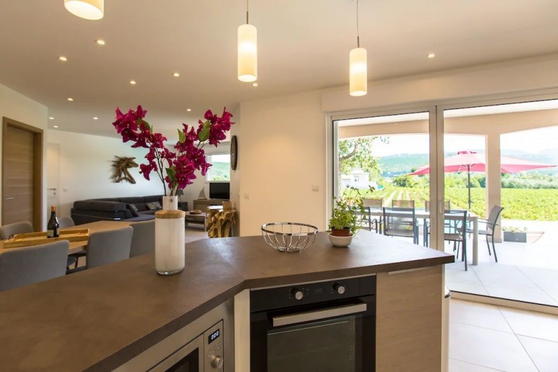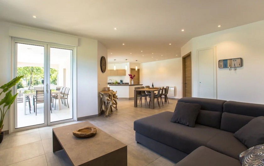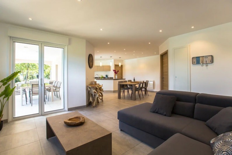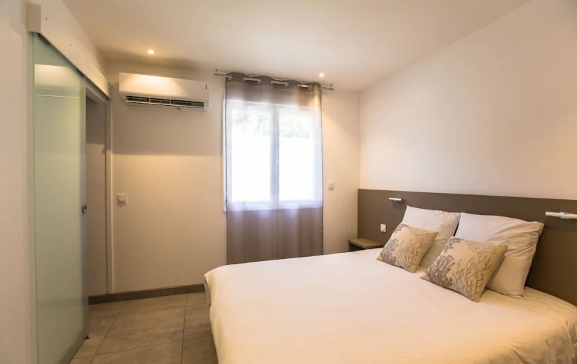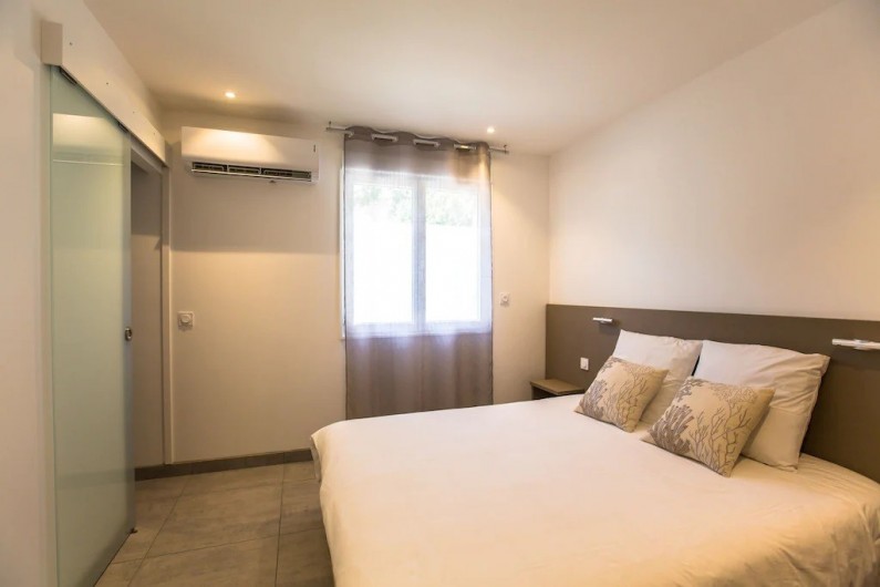 La villa dispose d'une grande pièce de vie très lumineuse avec un espace cuisine équipée avec îlot, un coin repas et salon. Une chambre parentale avec lit 160x200 cm, un coffre-fort et salle de bain privée avec douche à l'italienne. Une deuxième chambre avec lit de 160x200 cm avec accès