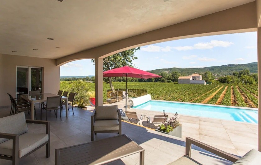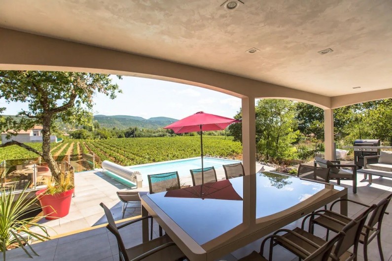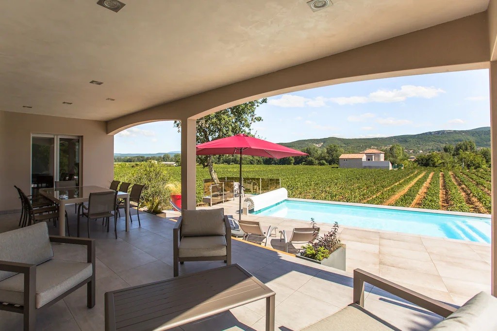 Profitez d'une villa neuve individuelle de 95 m² de plain-pied avec une terrasse couverte éclairée et aménagée de 30 m² avec salon de jardin, canapé bas, barbecue à gaz, piscine privée de 8x4m traitée au sel et sécurisé par un volet roulant électrique, le tout sur un terrain privatif.