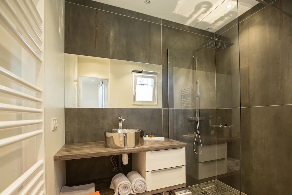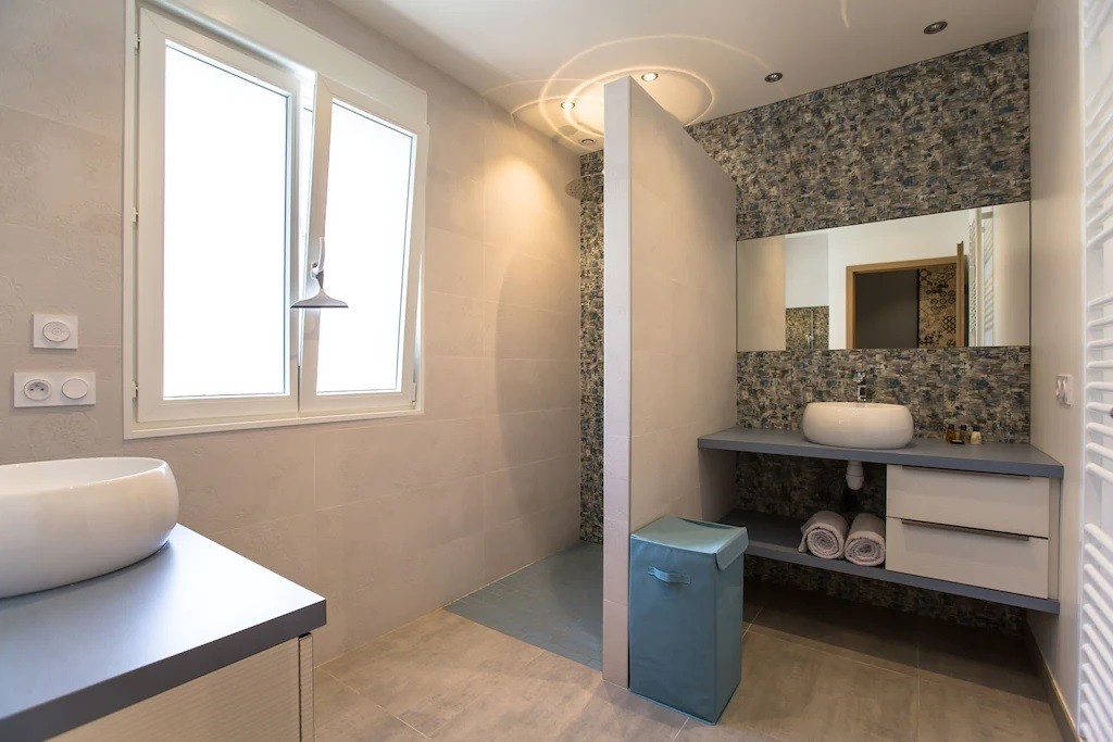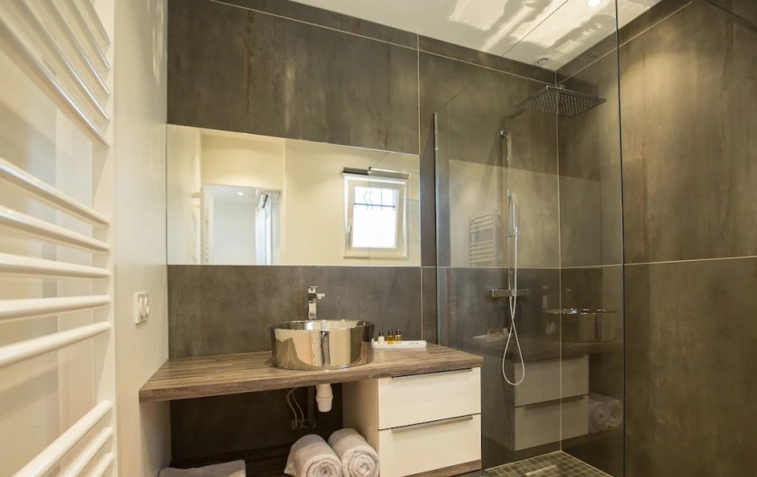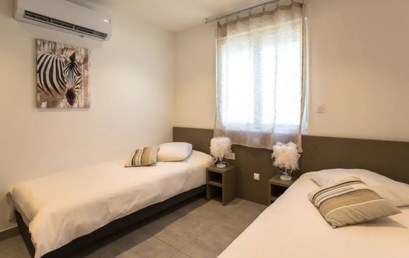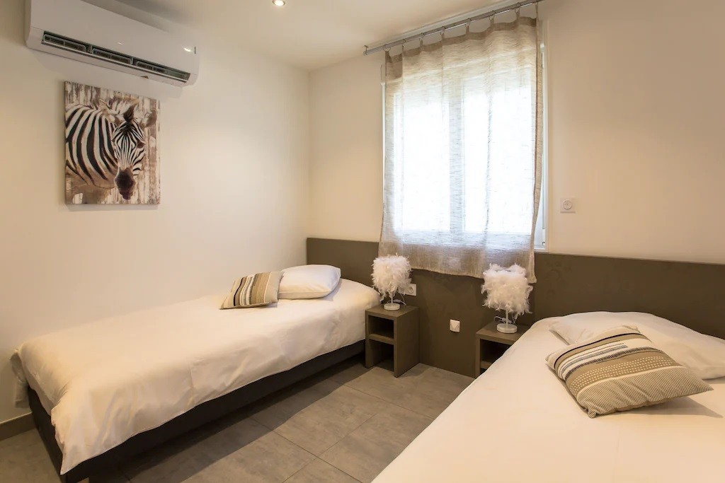 terrasse. Une troisième chambre avec deux lits de 90 x 200 cm . Chaque chambre est climatisée, avec grand placard de rangement. Une salle de bain avec deux vasques et douche à l'italienne. Un wc indépendant.