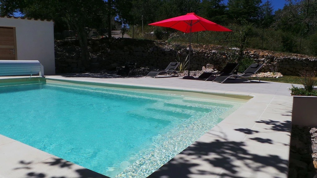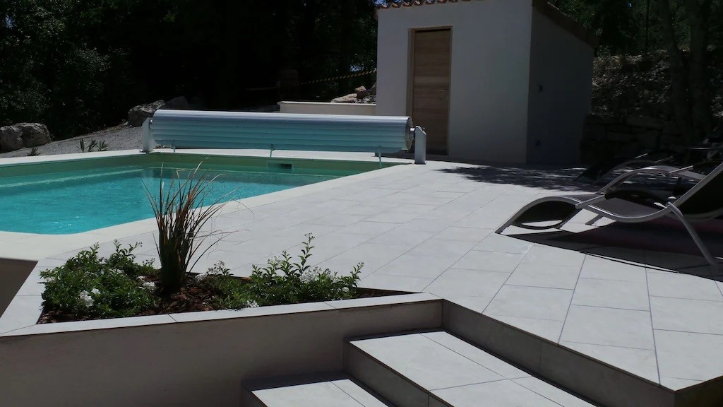 Piscine de 8x4 m par traitement au sel, Ph automatique, sécurisé par un volet roulant électrique.