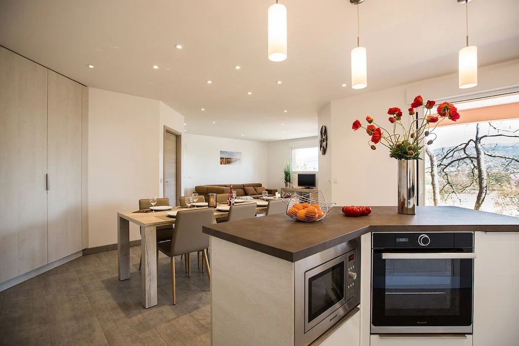 Cuisine entièrement agencée, plaque induction, four, micro-ondes, lave-vaisselle, réfrigérateur, cafetière, bouilloire expresso, etc..