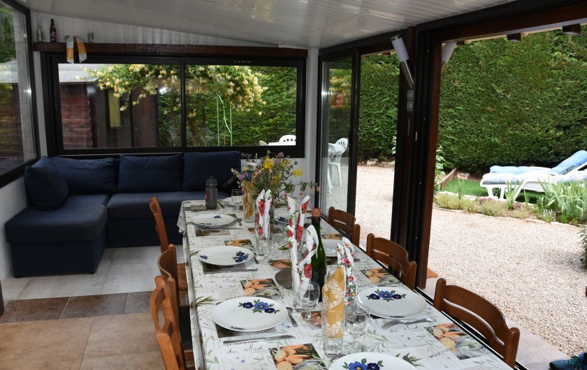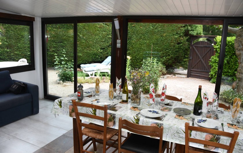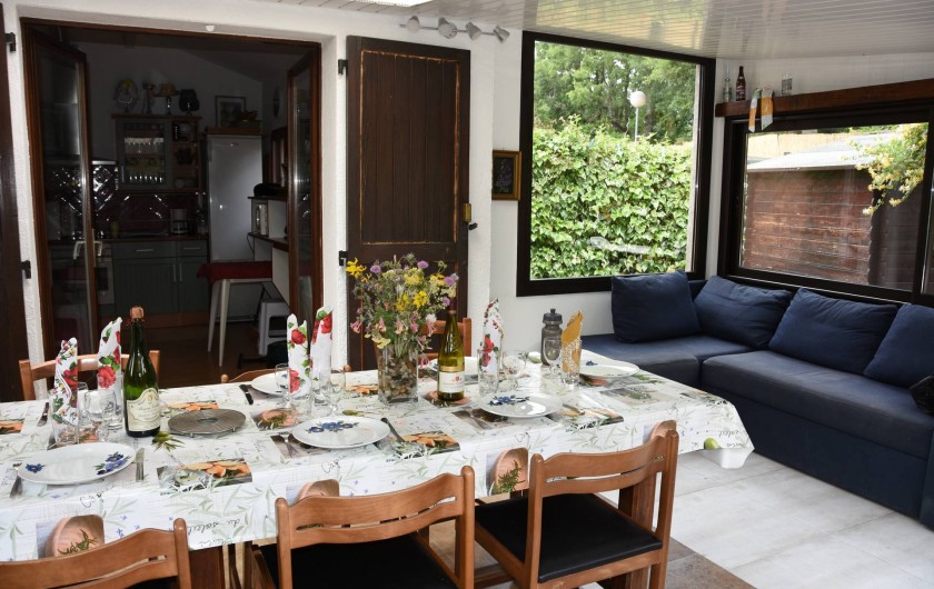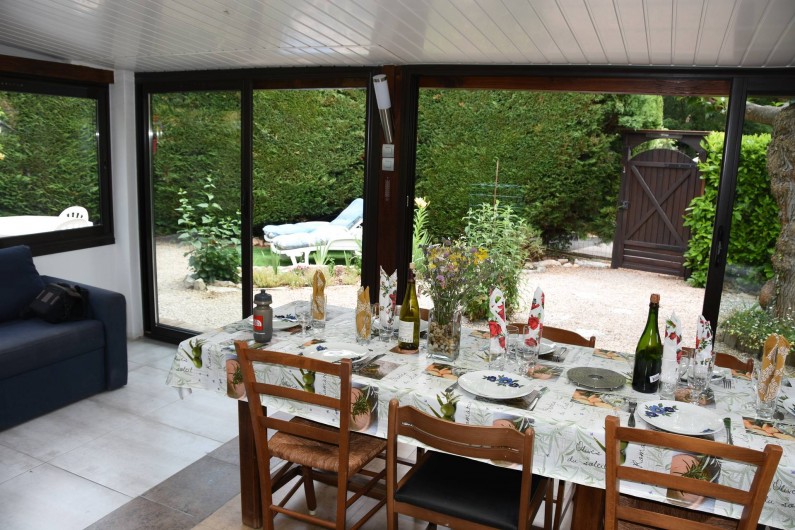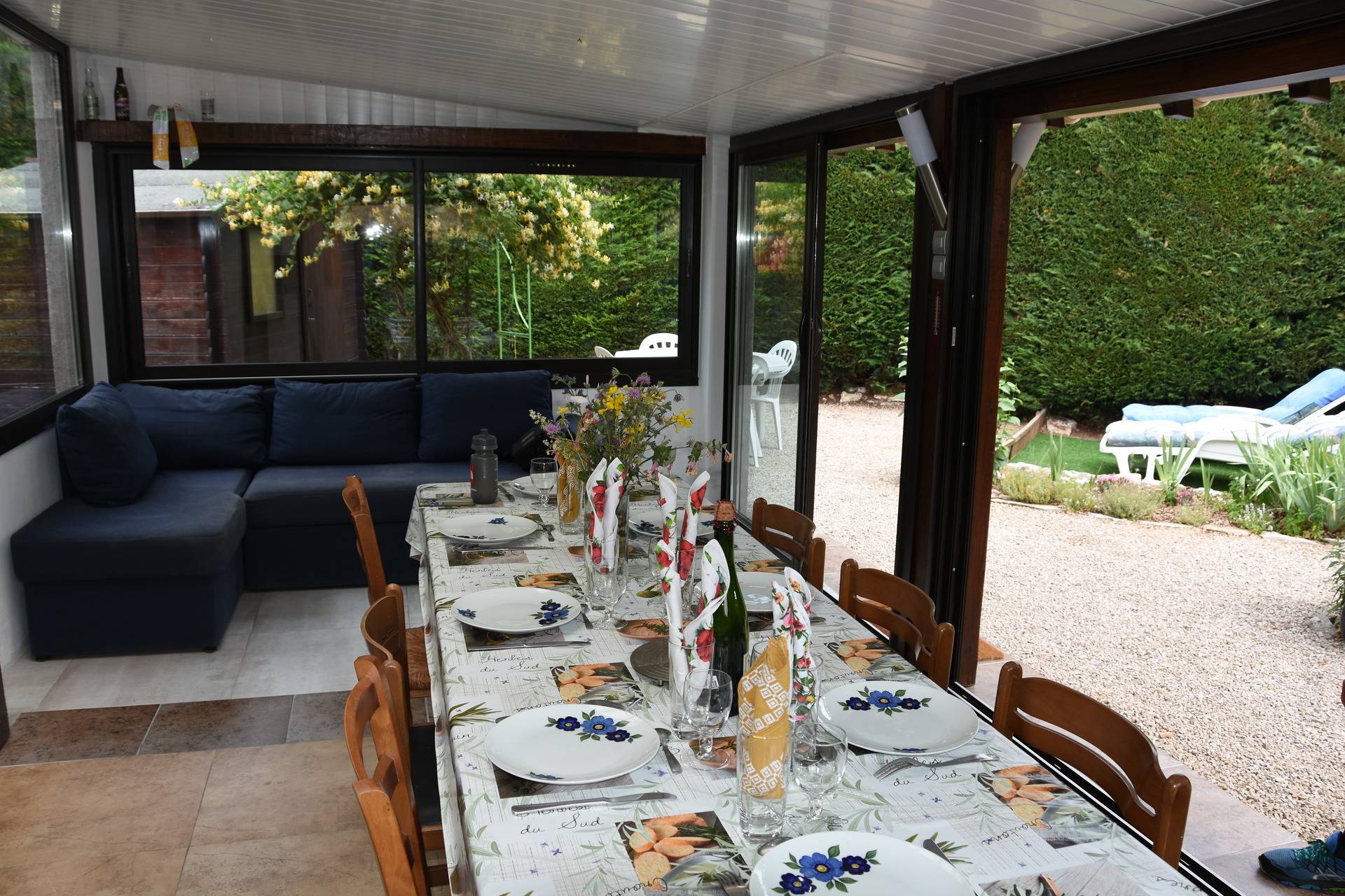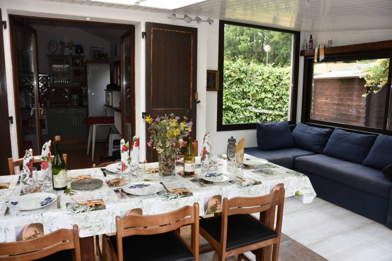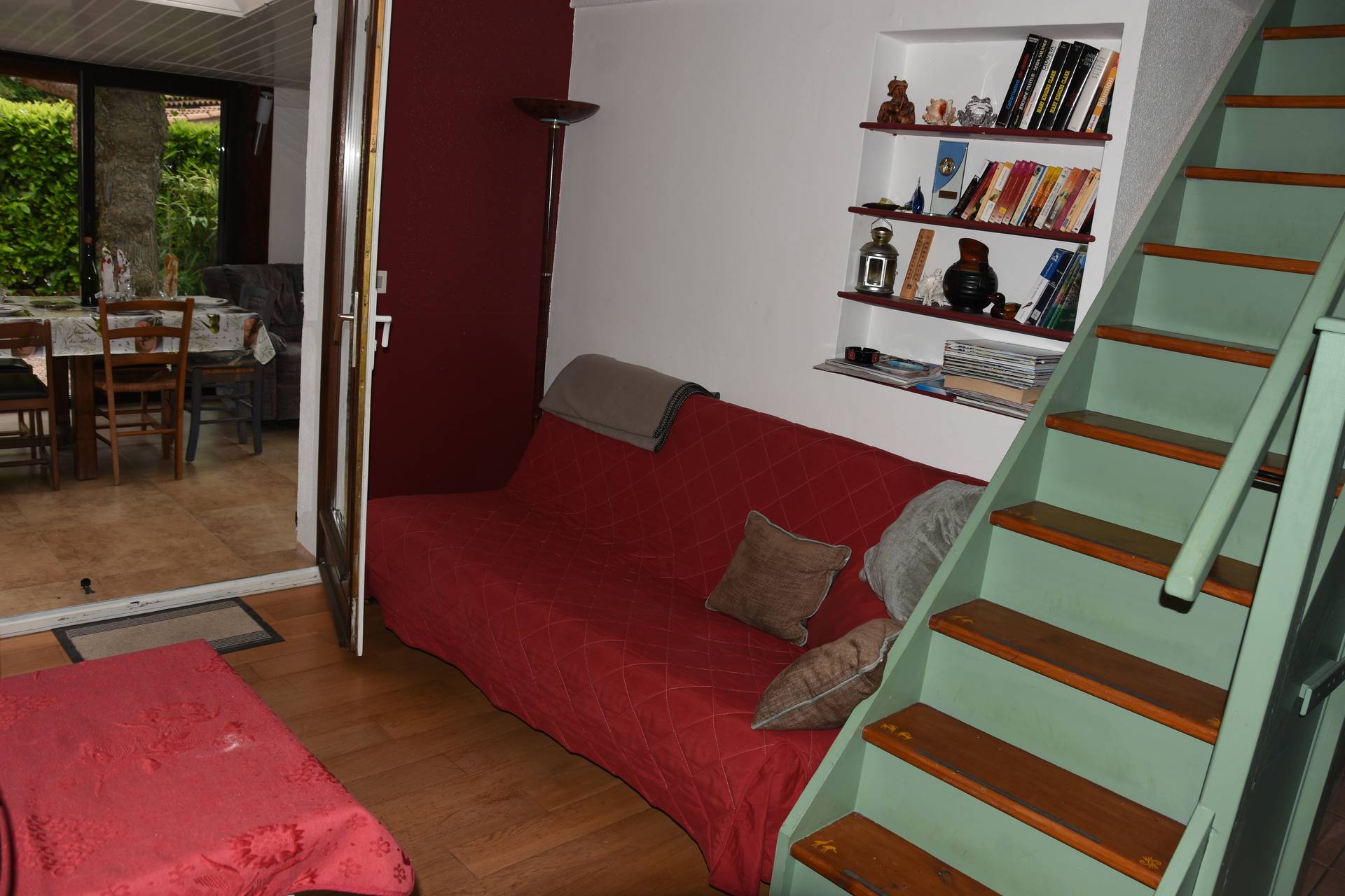 Surface de 55 m² comprenant un salon avec un grand coin cuisine, une véranda fermée de 20m² 1 chambre avec 1 lit de 140 cm, une mezzanine fermée avec 2 lits de 90 cm, une salle de douche avec WC. Un jardin de 150 m² ombragé avec abri jardin.