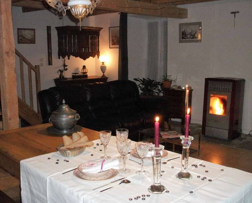 Séjour avec poêle à granulé, cuisine, entièrement équipée, ouverte sur grande pièce à vivre.