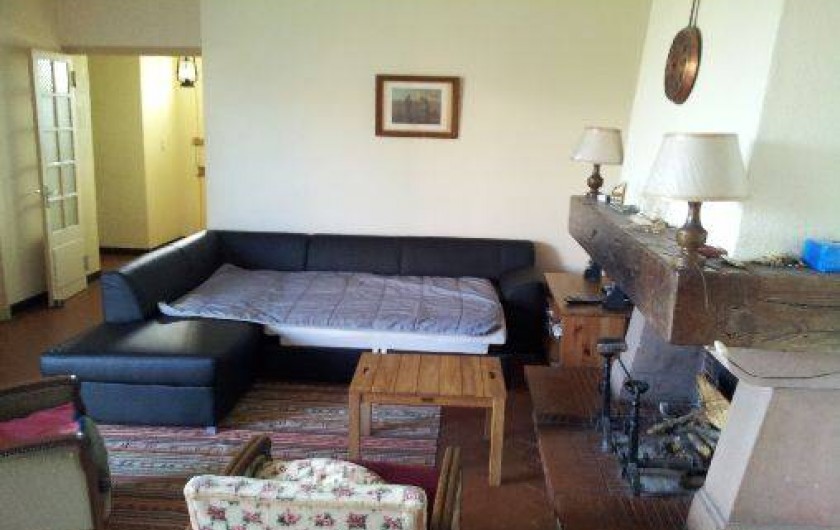 une cheminée au centre et d'un coté le coin salon avec canapé d'angle convertible et fauteuils devant l'espace tv video son