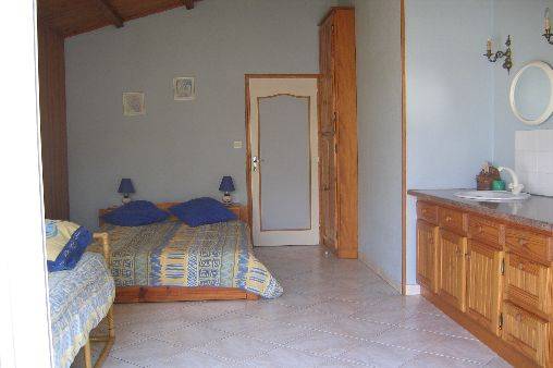 une grande chambre avec lavabo, un grand lit 140 cm et un lit pour 1 personne , rangement.
