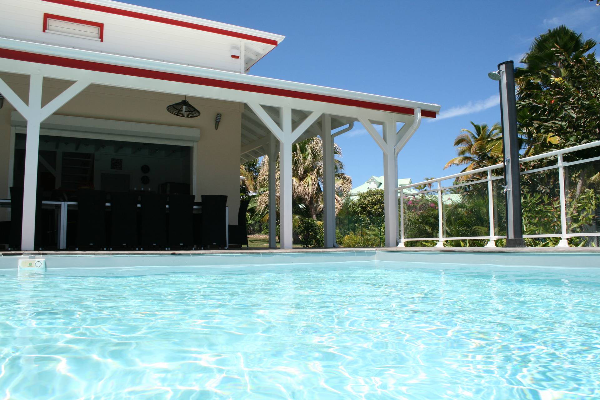 villa entièrement renovée avec vue imprenable sur Marie Galante , grande terrasse decouverte avec transats , terrasse couverte avec table de 14 couverts, salon sous terrasse couverte de 14 places, salle a manger salon cuisine américaine ouverte sur la terrasse couverte, 5 chambres dont une suite parentale avec salle d'eau et wc privatif, deux autres salles d'eau et 3 WC , cellier, grande mezzanine ouverte sur le salon salle a manger , les chambres sont climatisées et la mezzanine également la piscine à sel et à débordement avec spa , sur terrain clos de 1500 M2 portail electrique , … parking privé de 3 voitures Lire moins Lire la suite