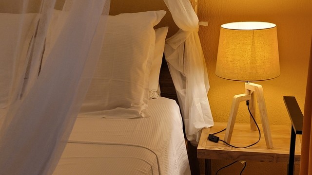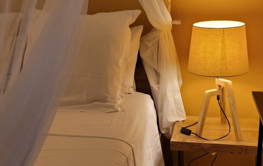 Couchage : 1 lit baldaquin 160cm et 2 lits 90cm pouvant être raccordés et proposés 1 lit 180cm.