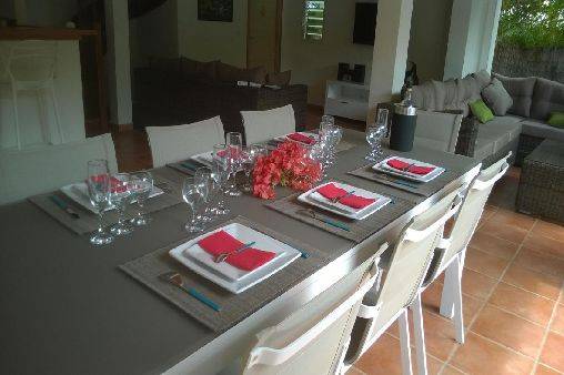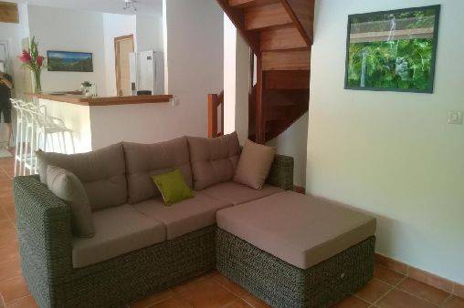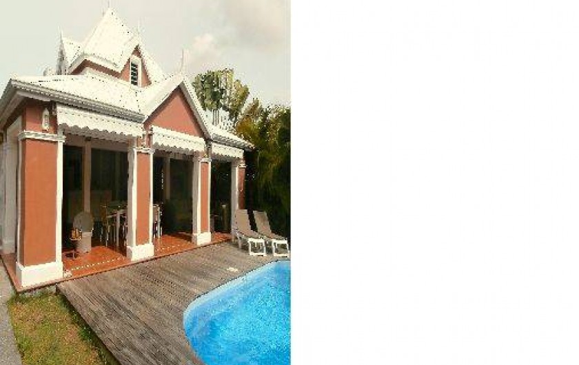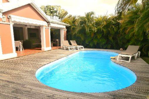 Location saisonniere Villa Cotton avec piscine privative dans résidence privée et cloturée avec 3 chambres 3 salles d'eau 2 WC cuisine super équipée cellier, salon salle à manger ouverte sur la terrasse et la piscine jardin arboré