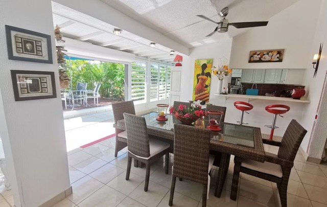 Au sein de la résidence Karukera, proche de Saint-François, à 300m à pieds de la plage de l'Anse à la Gourde et à 2km de Tarare (plage naturiste), cette jolie villa créole (96m²) accueille confortablement jusqu'à 4 personnes.