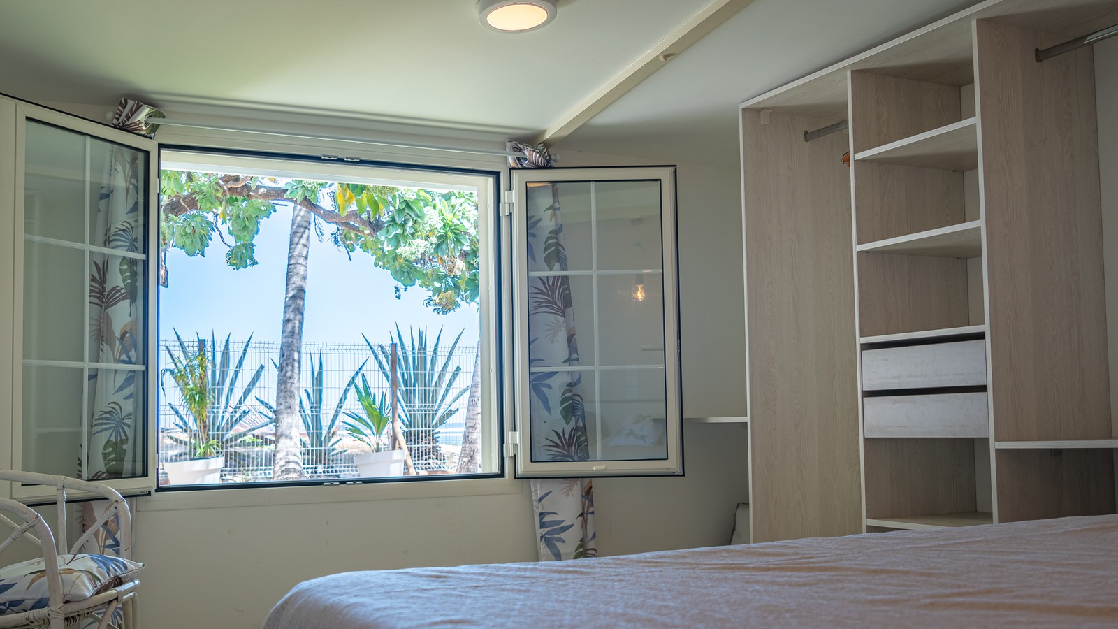 - 3 chambres climatisées : 2 chambres « vue mer » avec lit 160 x 200 cm et 1 chambre « vue jardin » avec 2 lits simples 90 x 190 cm (accolés ou séparés)