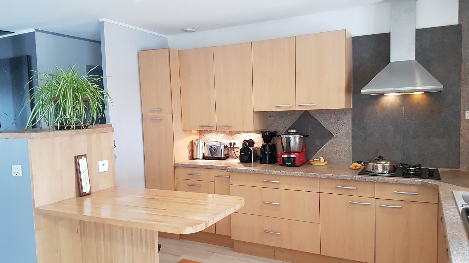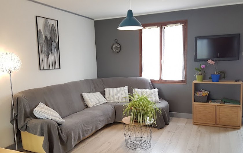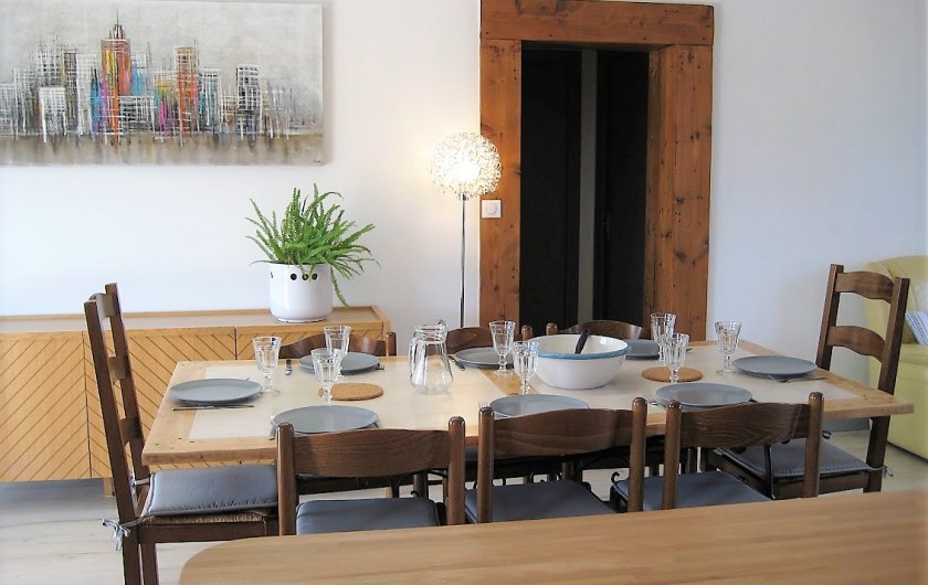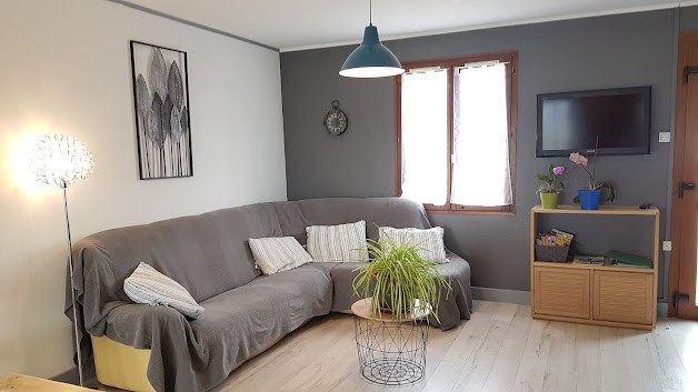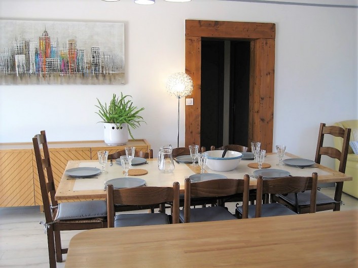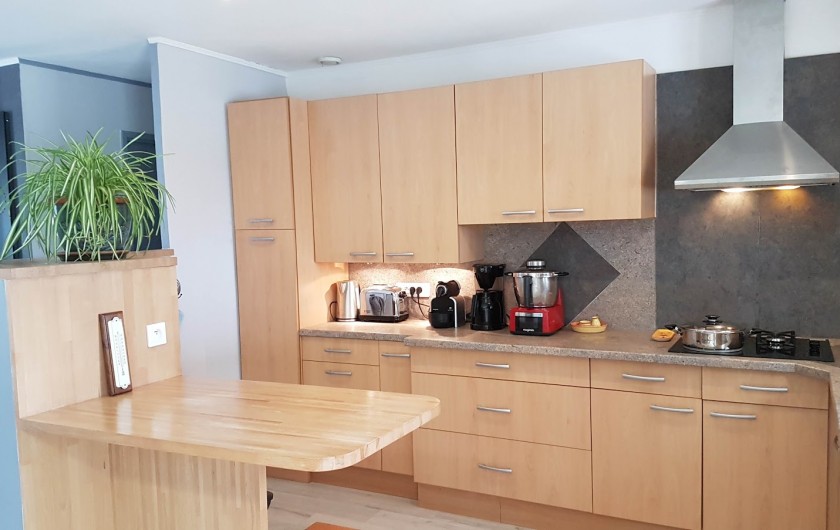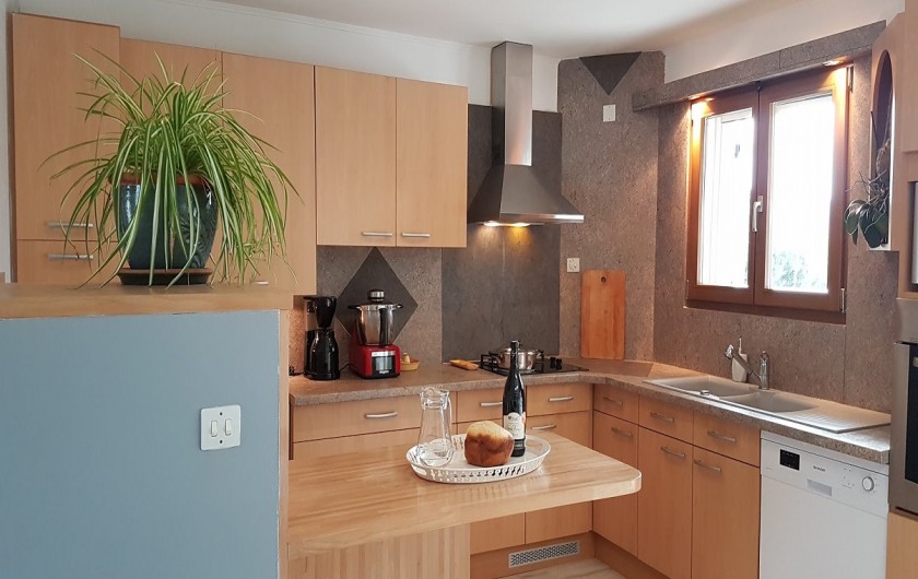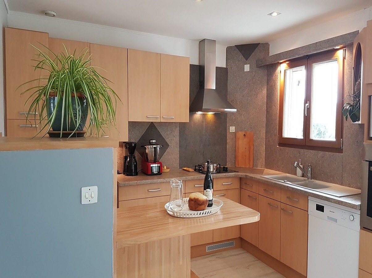 Séjour avec cuisine américaine toute équipée : lave-vaisselle, four, micro-ondes, cafetières, plaque gaz/électrique, tous les ustensiles...