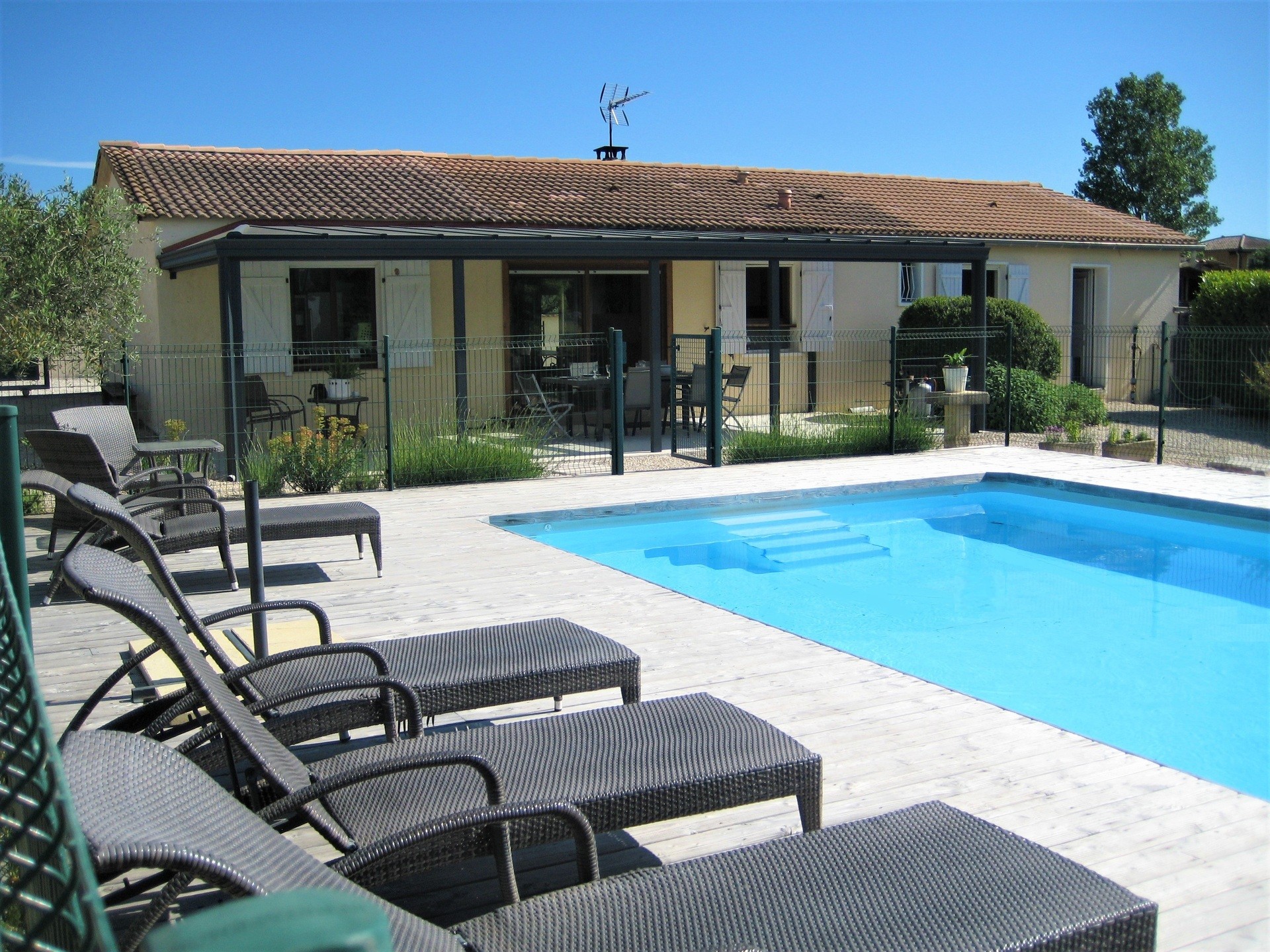 Grande villa de plain pied entièrement rénovée en 2018, capacité 8 personnes, avec jardin de 1500m² et une piscine privée clôturée de (9x5m) avec terrasse en bois.