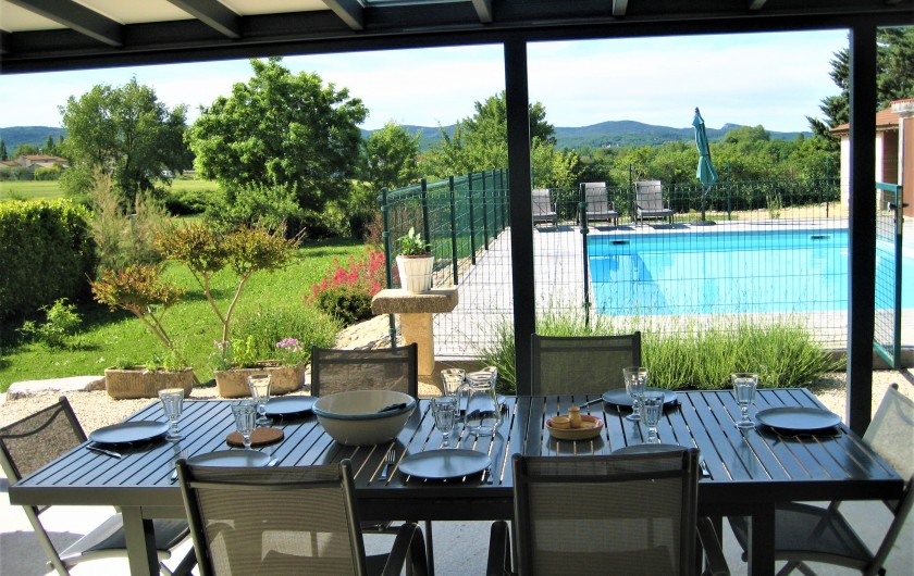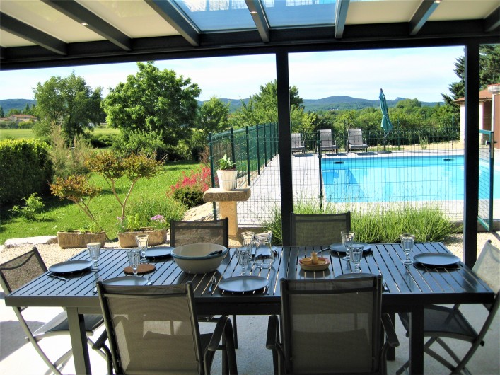 Grande terrasse couverte avec mobilier de jardin et barbecue +plancha... donnant sur la piscine