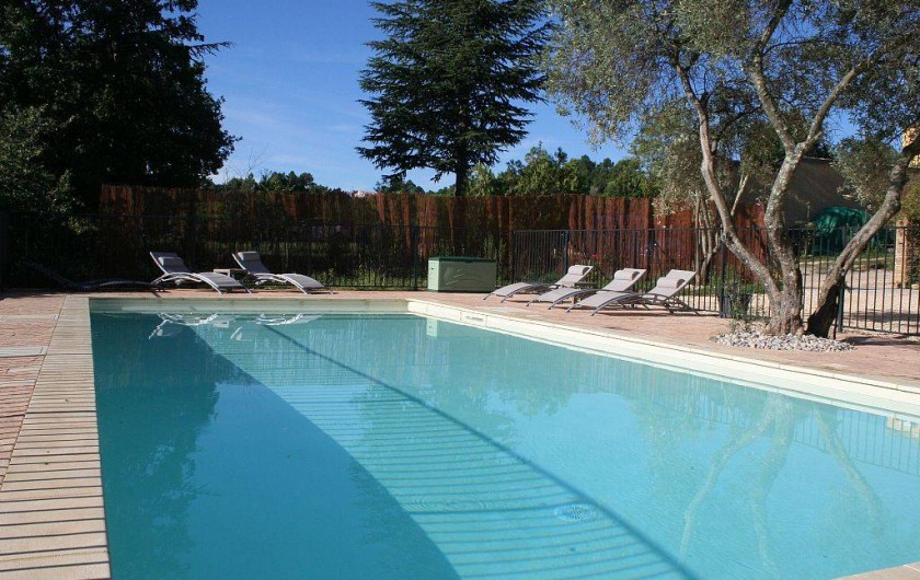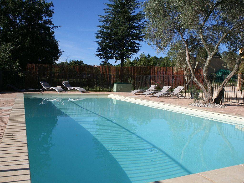 Piscine privée, chauffée et sécurisée de 11m x 5m. Aucun vis à vis. Terrain arboré de 1200 m² : arbres fleuris, oliviers, lavandes, plantes aromatiques, grand