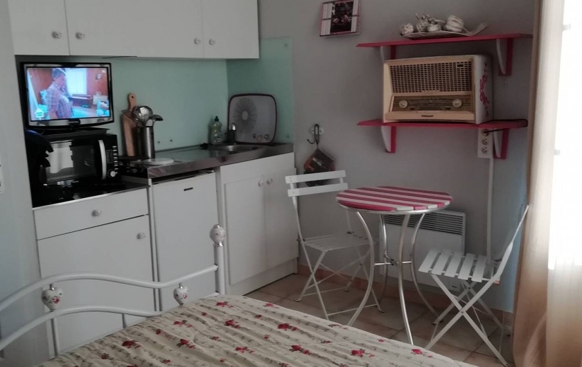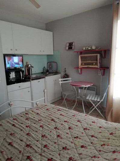 -1 pièce principale :coin salon avec un lit 140 (2 couchages), télé avec lecteur DVD, coin cuisine : kitchenette équipée : four multi-fonctions, évier, frigo, 2 plaques électriques, table + chaises