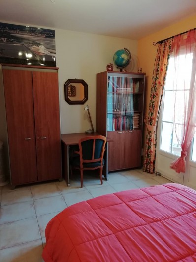 - 1 chambre–bureau avec bibliothèque : un lit (2 couchages) avec vue sur la piscine