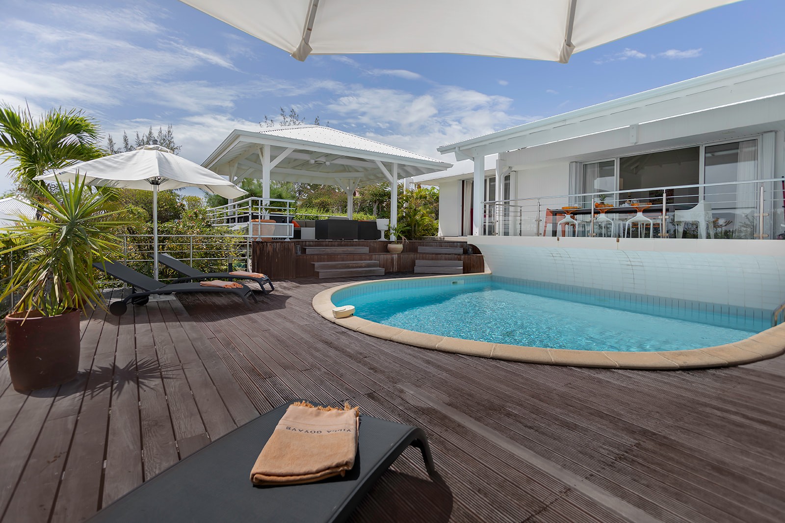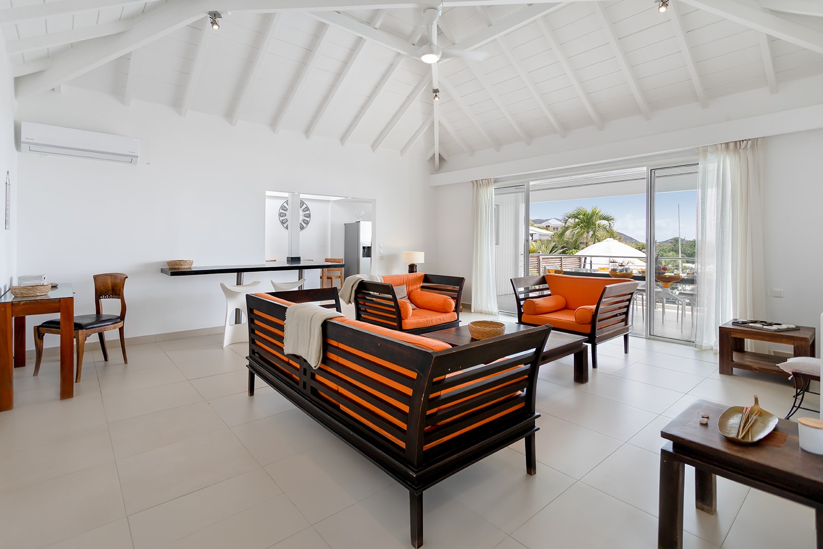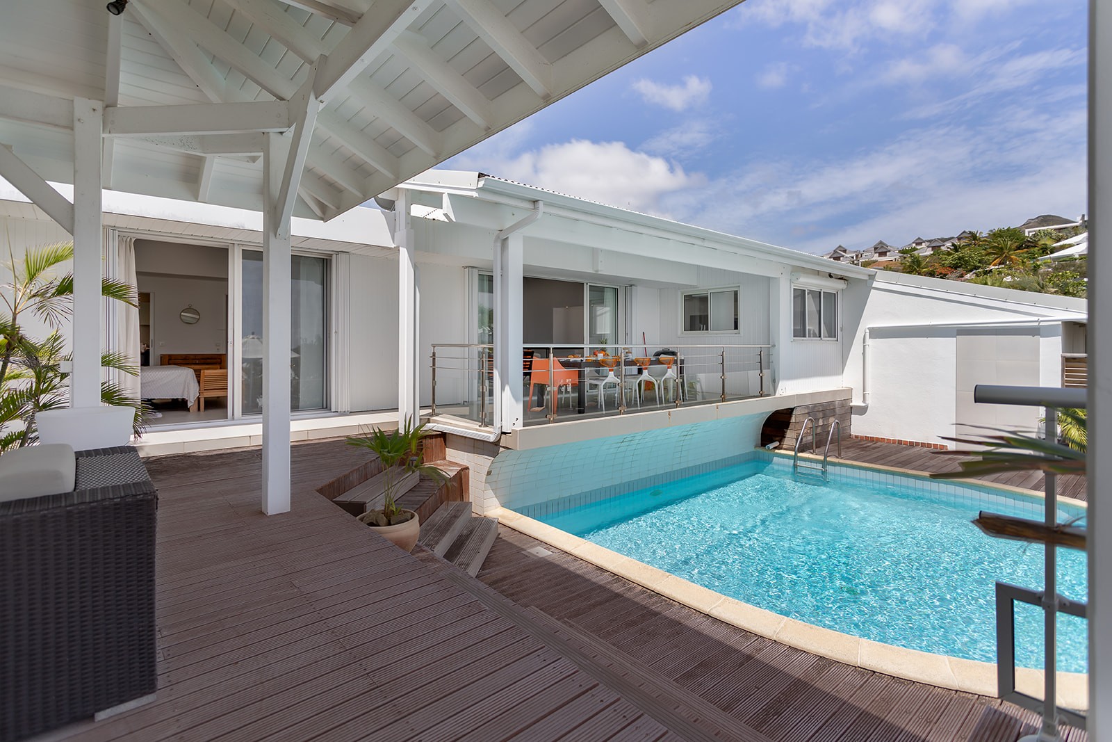 La terrasse surplombant la piscine privée dispose d’une grande table pouvant accueillir jusqu’à 8 personnes et offre une vue imprenable sur Orient Bay et l’océan.