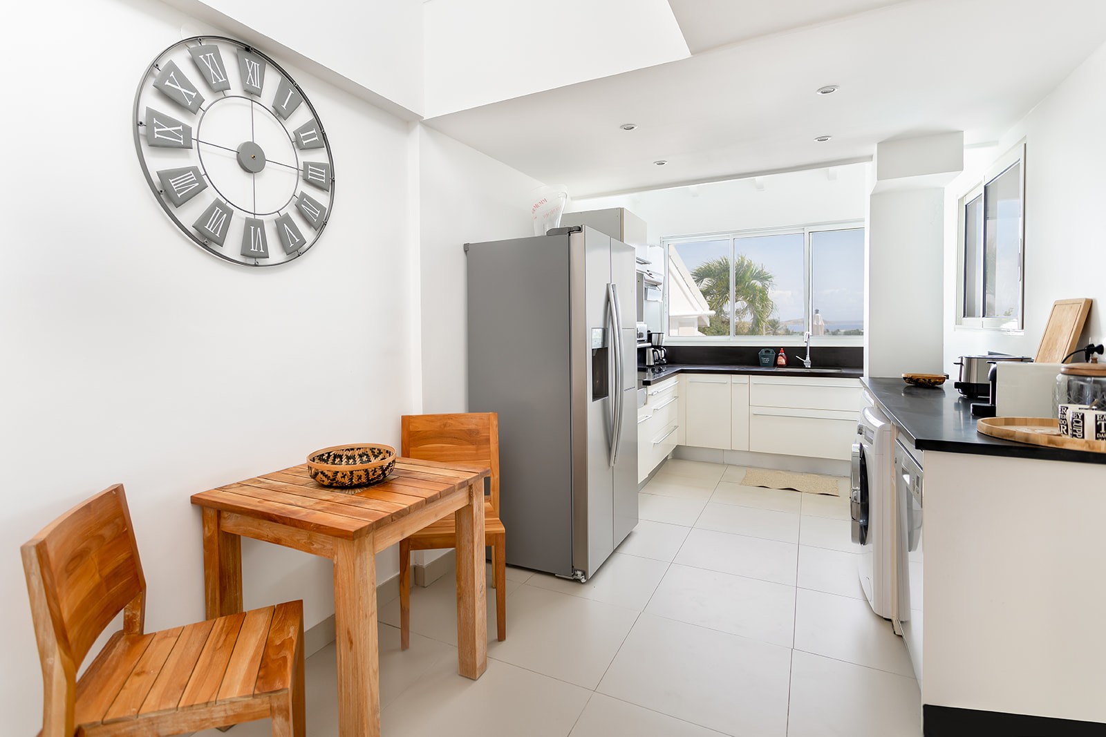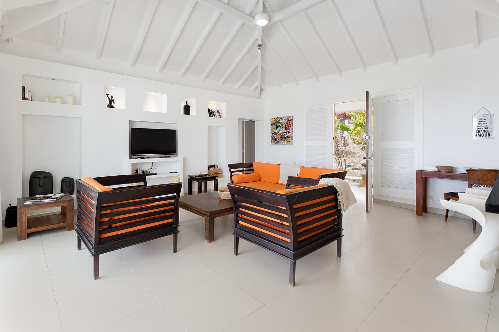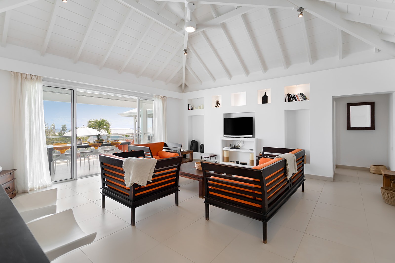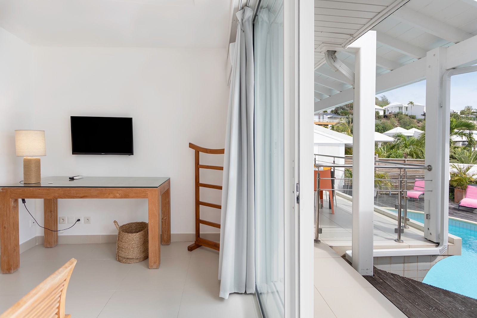 La terrasse surplombant la piscine privée dispose d’une grande table pouvant accueillir jusqu’à 8 personnes et offre une vue imprenable sur Orient Bay et l’océan.