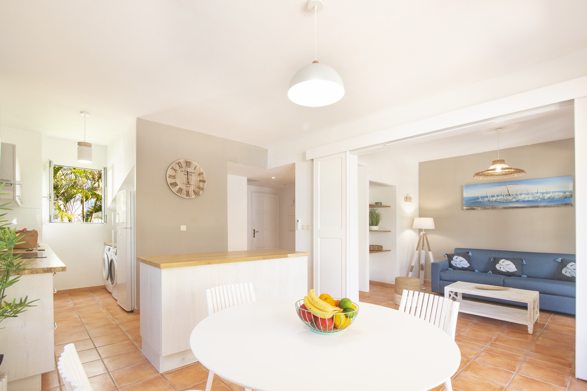 Au rez-de-chaussée se trouvent une 3ème salle de bain, une cuisine très lumineuse entièrement équipée (lave-vaisselle, machine à laver, sèche-linge). Le salon pouvant se fermer entièrement dispose d'un canapé-lit et le séjour s'ouvre sur la terrasse avec large table pouvant