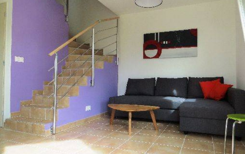 Séjour ouvert avec un canapé lit 140cm, TV LED 102cm avec TNT, 2 fenêtres avec volets.