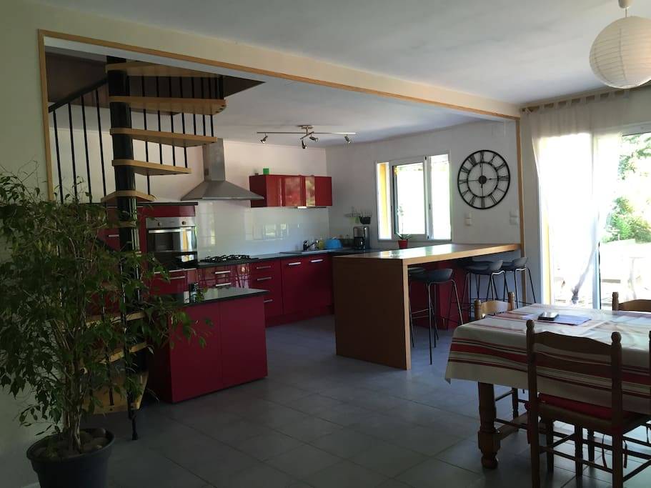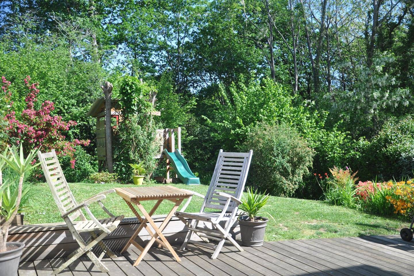 Dans maison mitoyenne à l'orée d'un bois, au fond d'un lotissement (impasse), quartier résidentiel très calme, boulangerie et autres commerces de proximité accessibles à pied ou en vélo ......