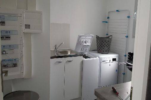 Cellier avec lave-linge, sèche-linge, évier, fer et table à repasser, aspirateur et nécessaire de ménage.