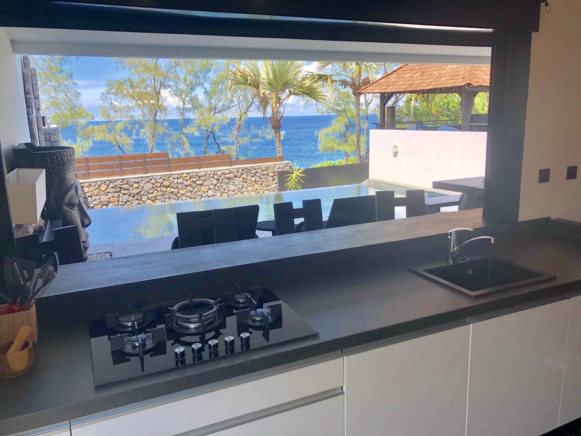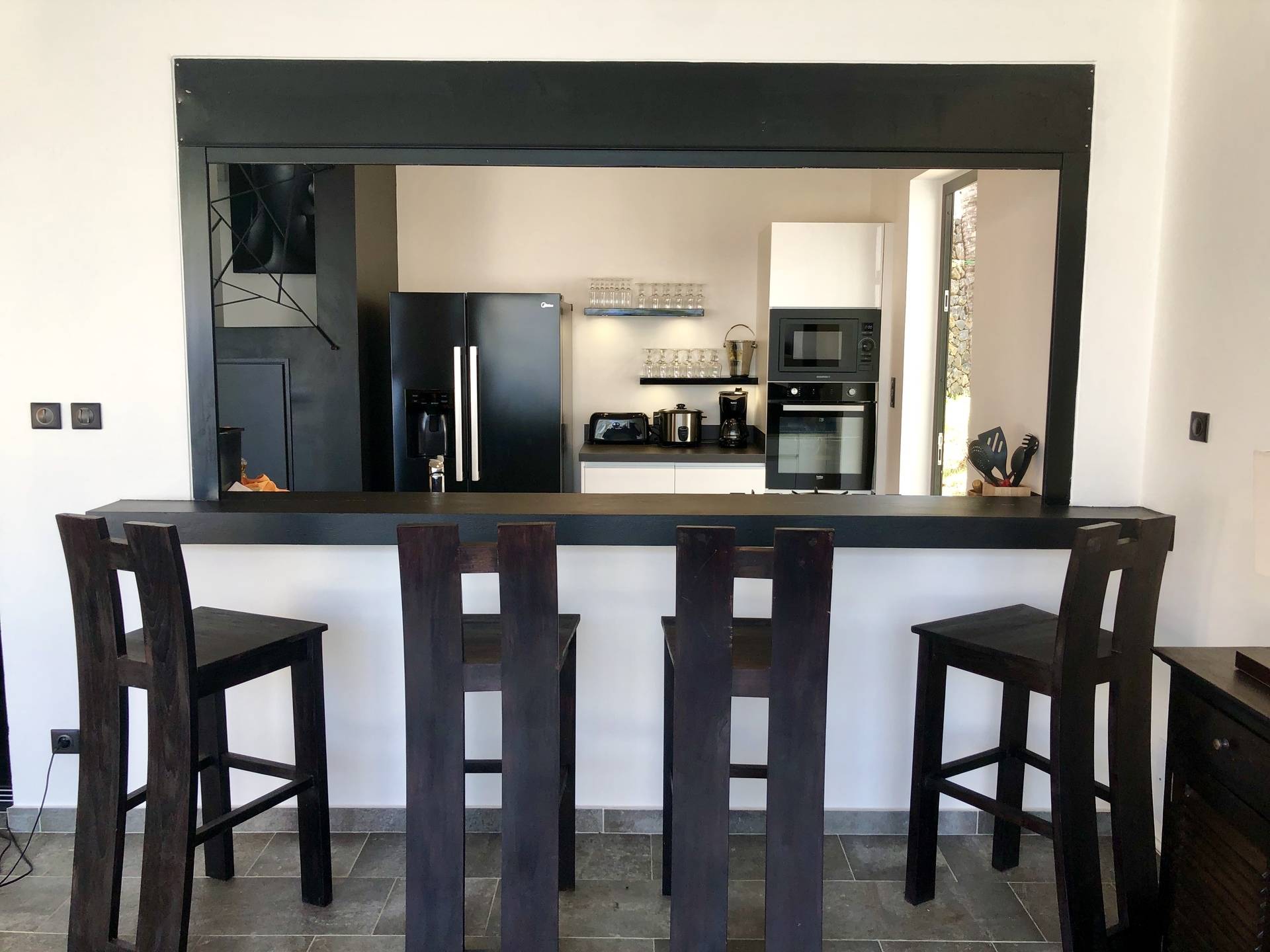 - d’une cuisine américaine moderne et toute équipée (four, four micro-onde, lave-vaisselle, frigo américain), avec un bar donnant directement sur la varangue et la piscine,