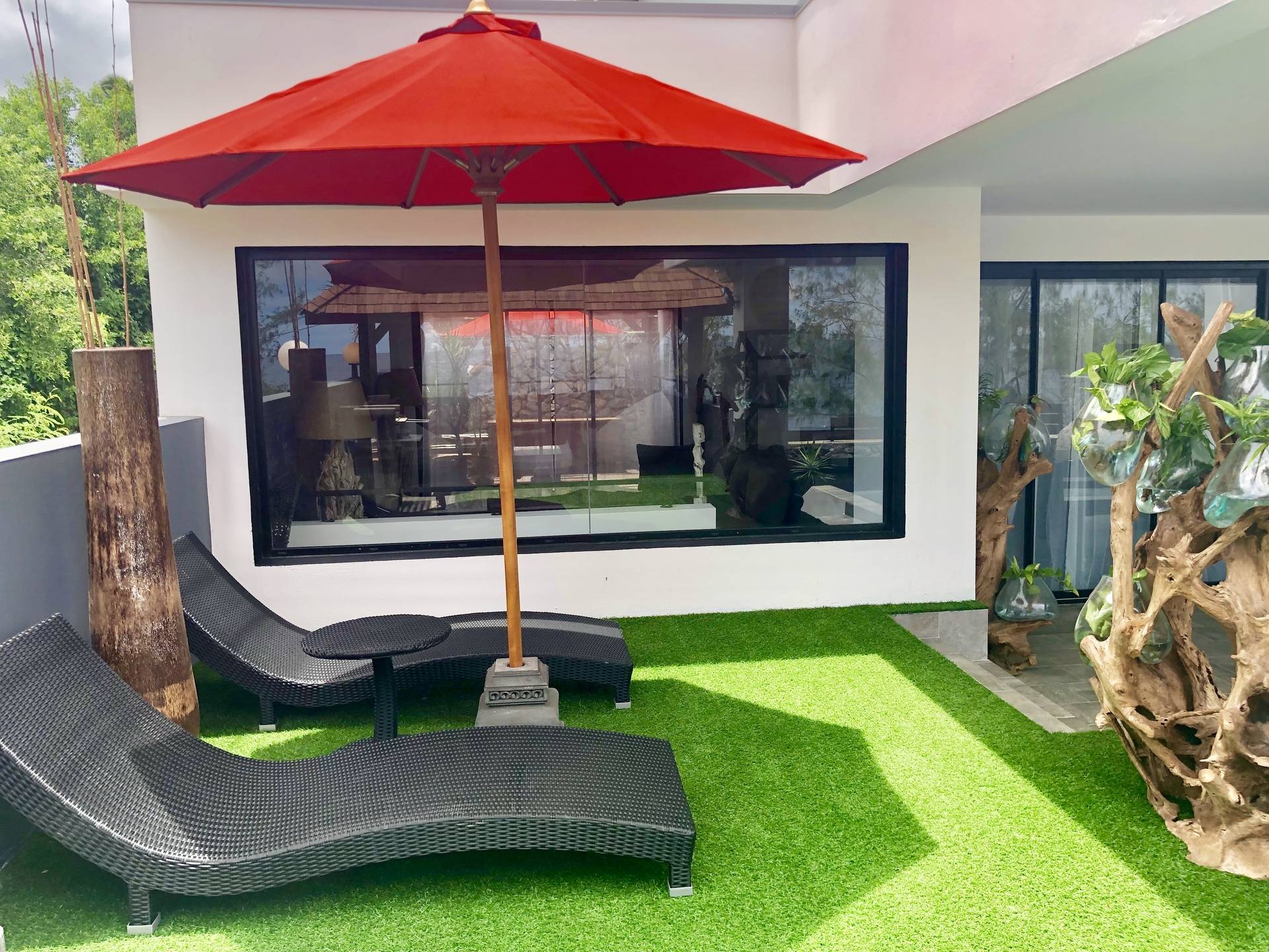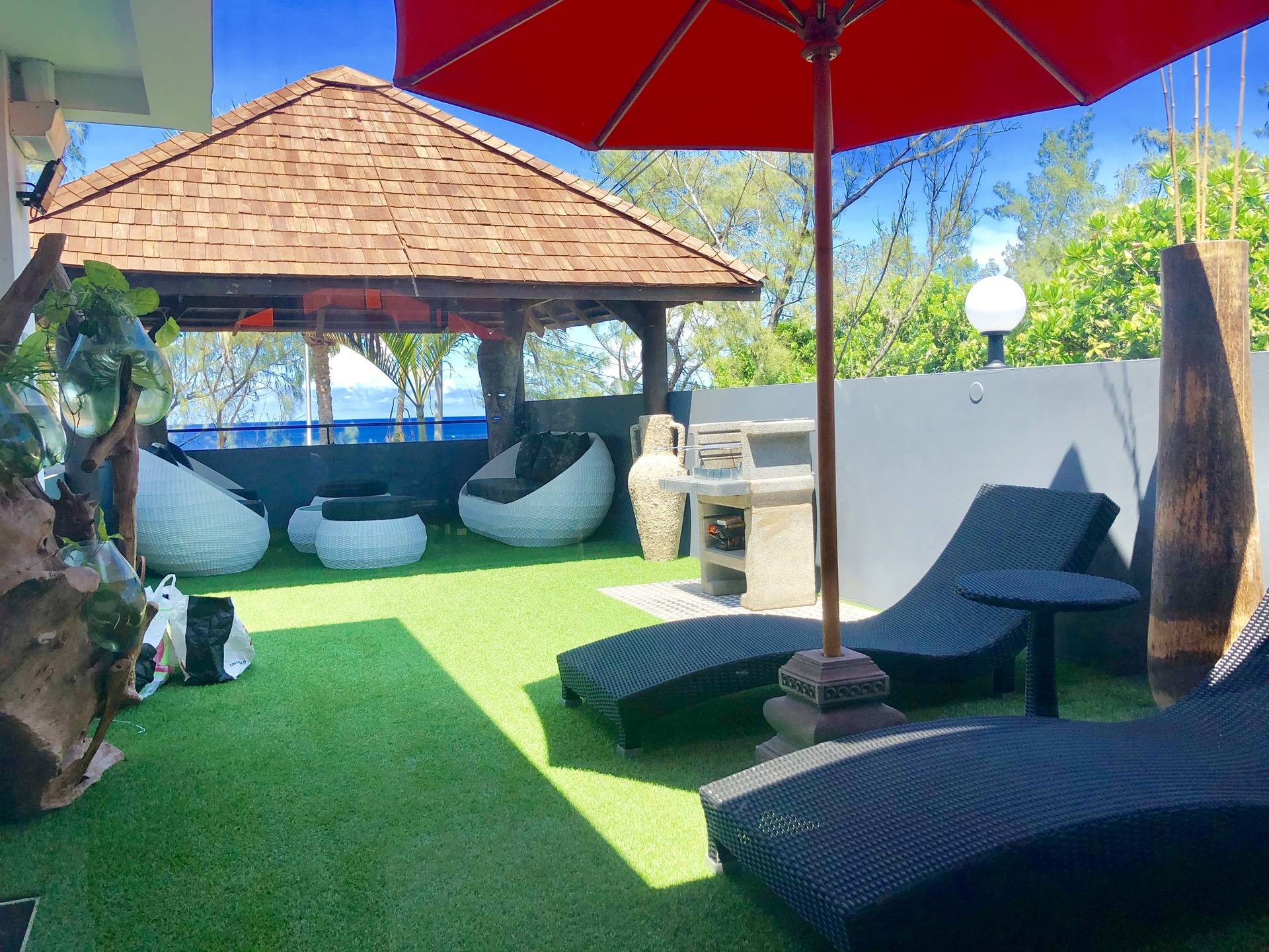 - une terrasse de 35 m² aménagé avec un épais gazon synthétique, partiellement abritée d’un kiosque balinais de 4,5m par 4,5 m, disposant d’un barbecue maçonné et d’un solarium...