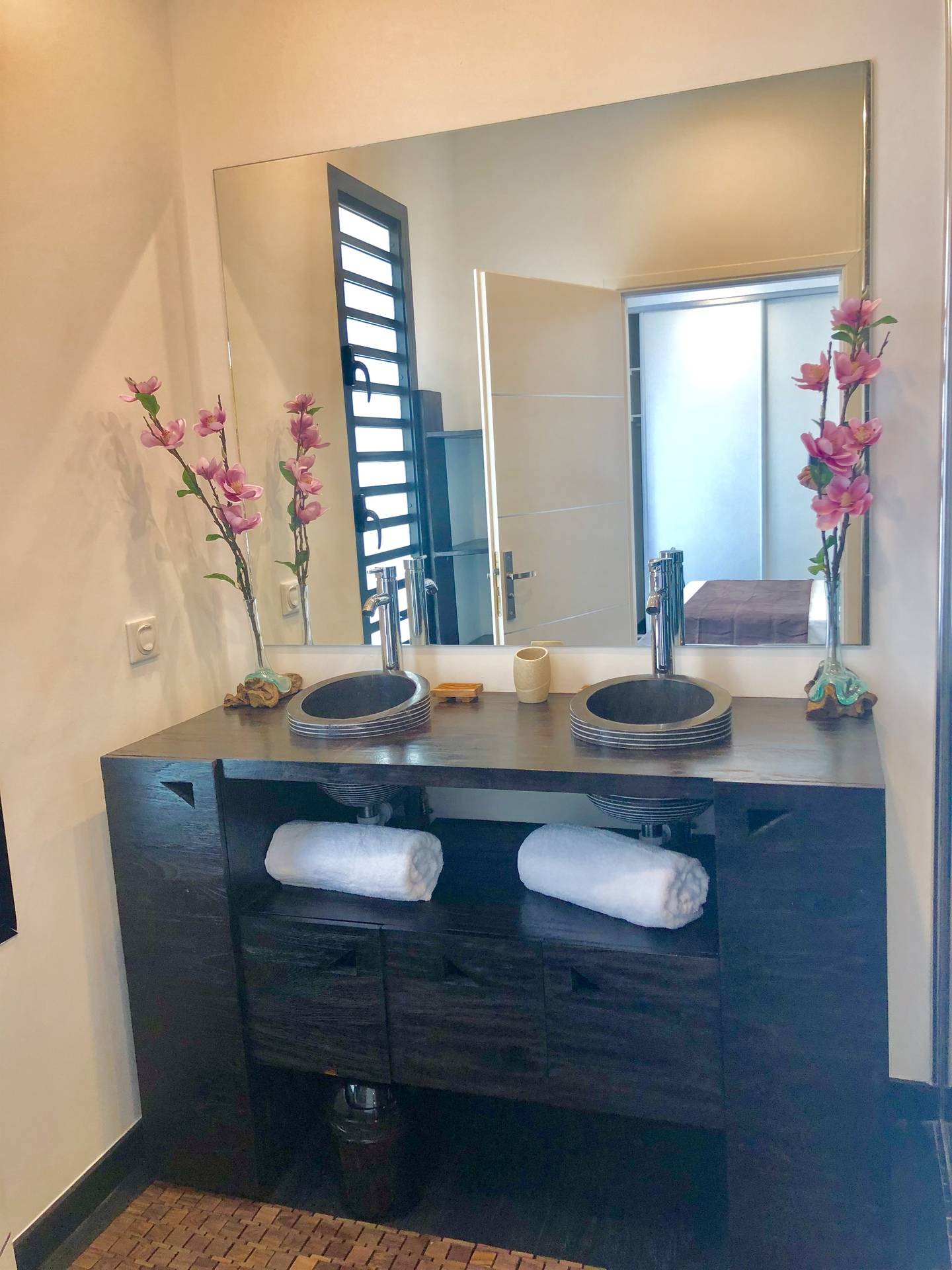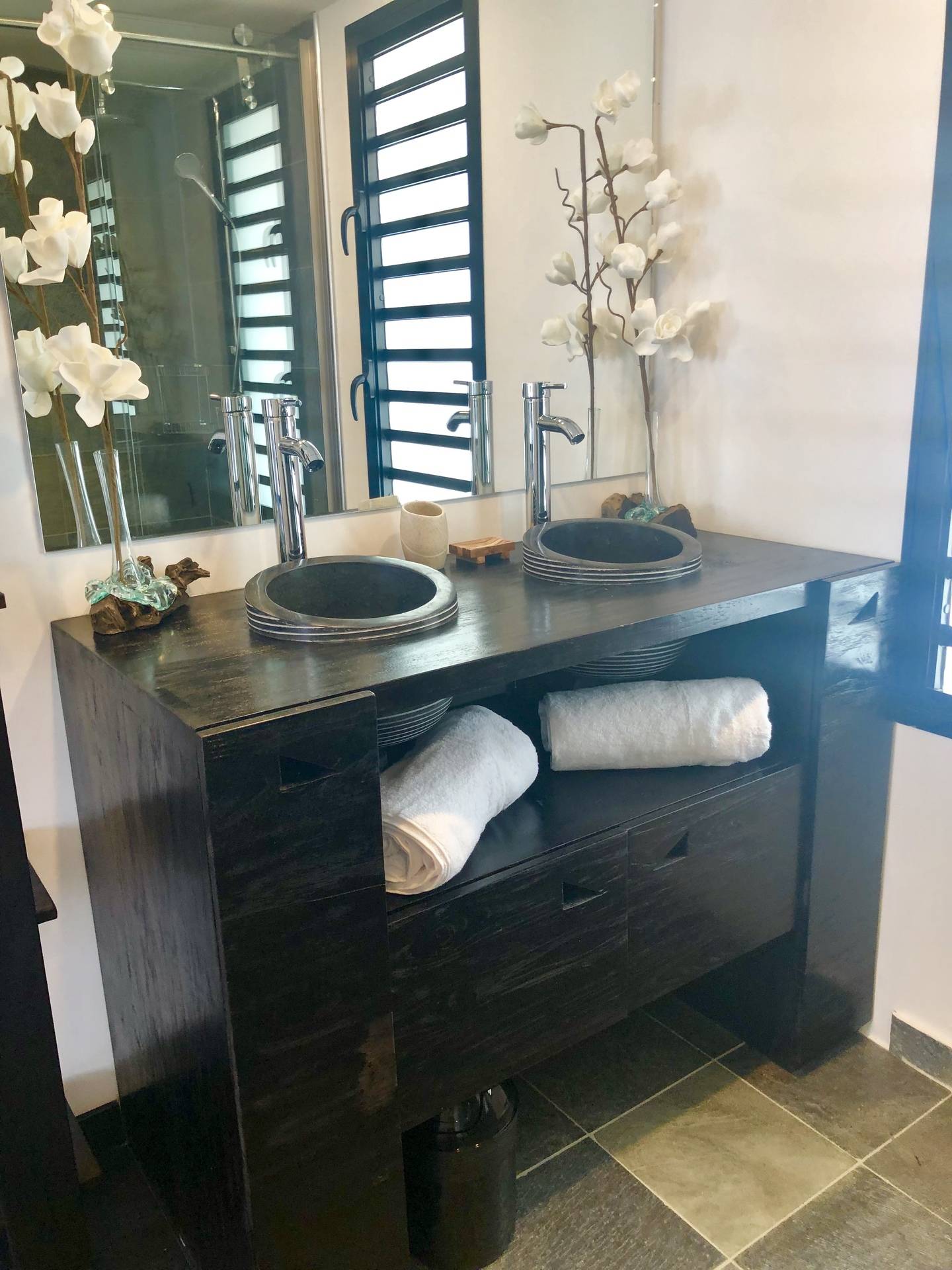 - quatre pièces d’eau : dont 3 salles d’eau équipées en spacieuses douches à l’italienne en pierre, et double vasques en pierre, et une salle de bains avec baignoire en angle à remous.