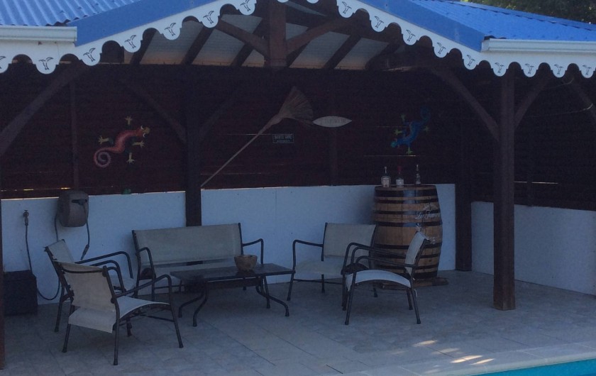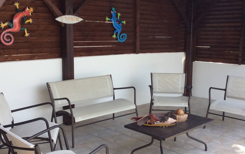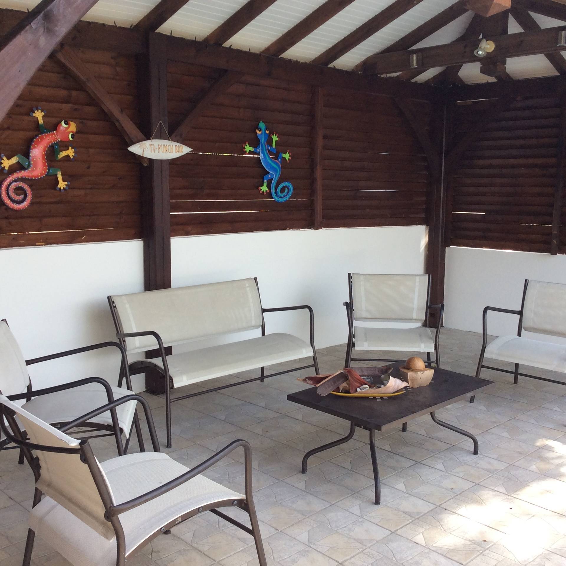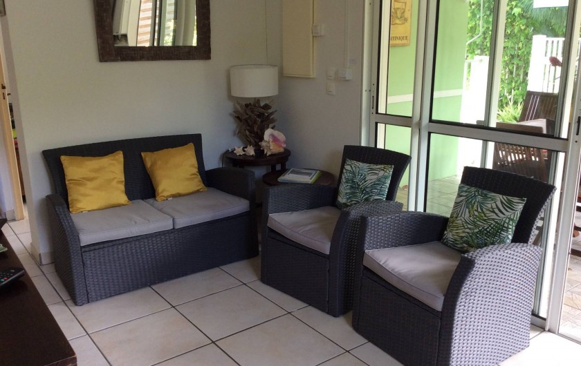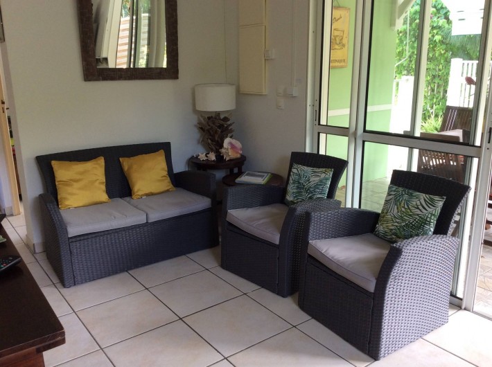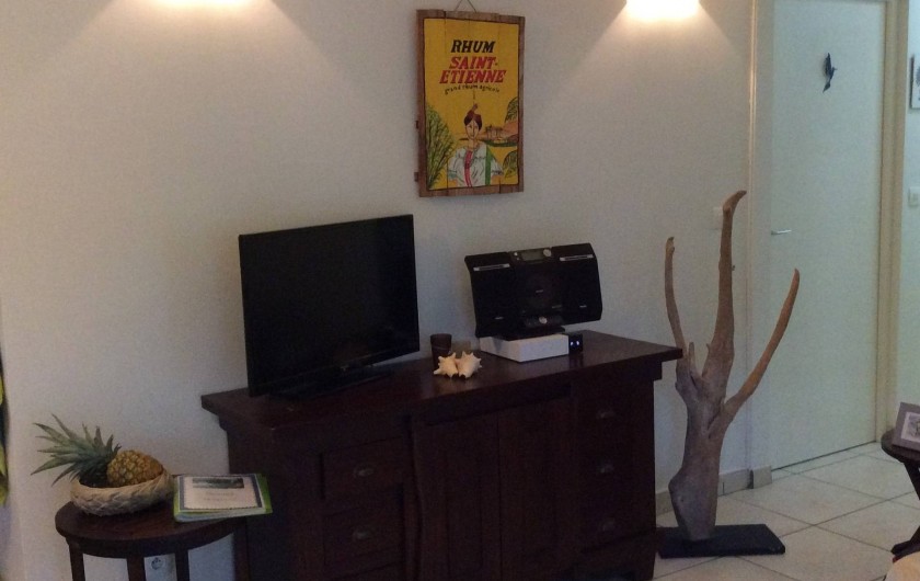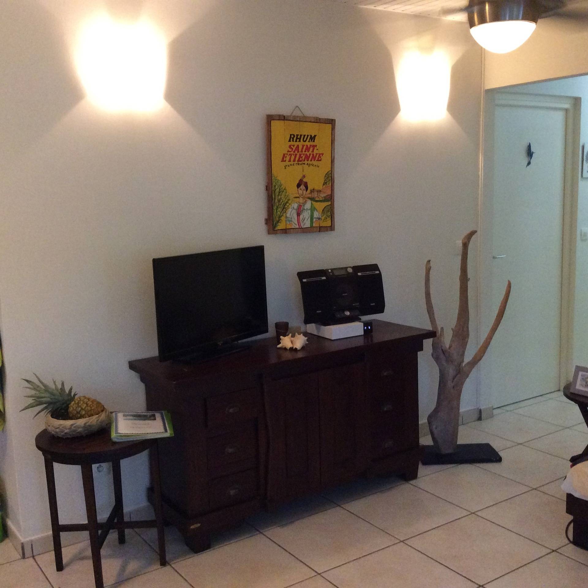 séjour attenant avec meuble de rangement, téléviseur, chaine Ifi, banquette deux places et ventilateur de plafond.