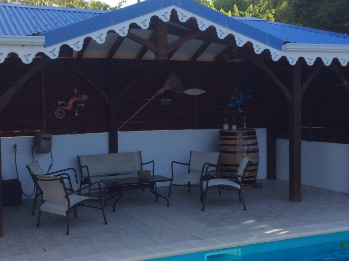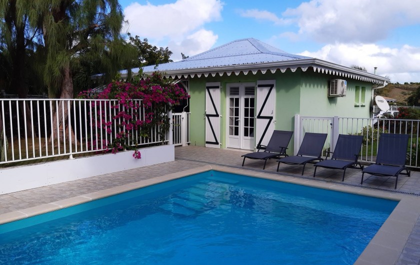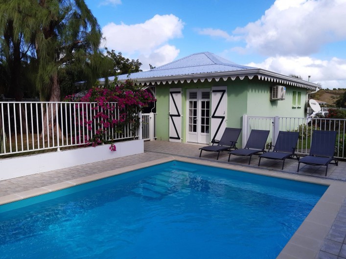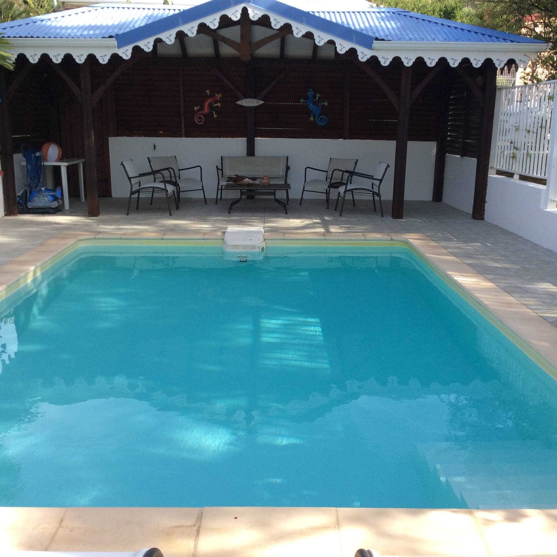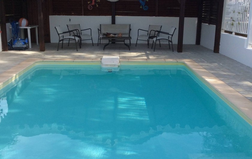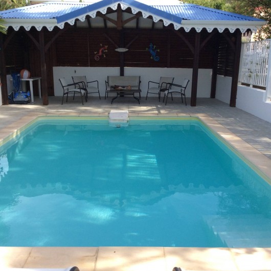 Piscine 6x4 par 140 de profondeur sécurisée par des barrières entourée d'une terrasse.